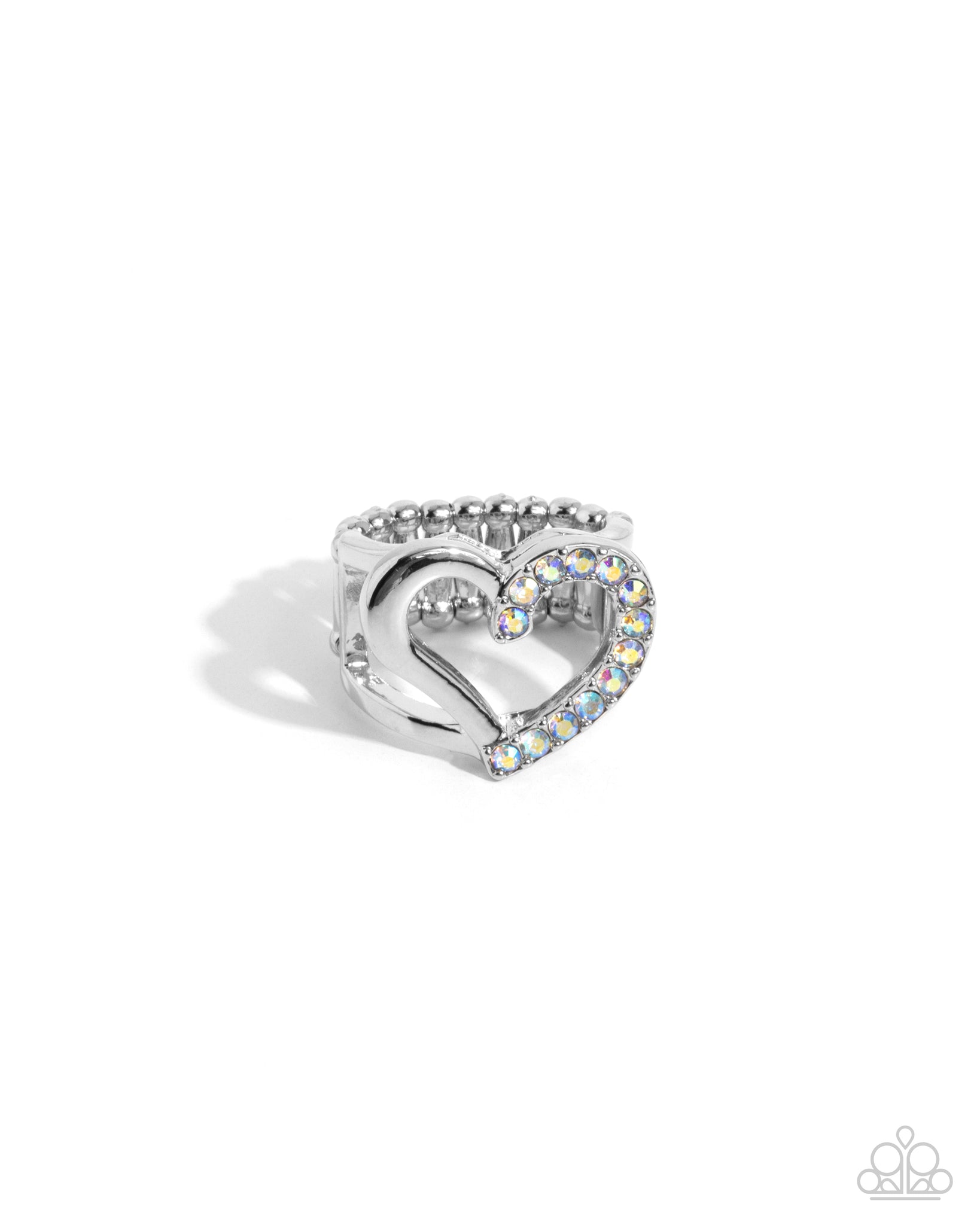 Glistening atop airy silver bands, an abstract half-silver half-iridescent rhinestone embellished heart stands out atop the finger for a romantic pop of color. Features a stretchy band for a flexible fit. Due to its prismatic palette, color may vary.