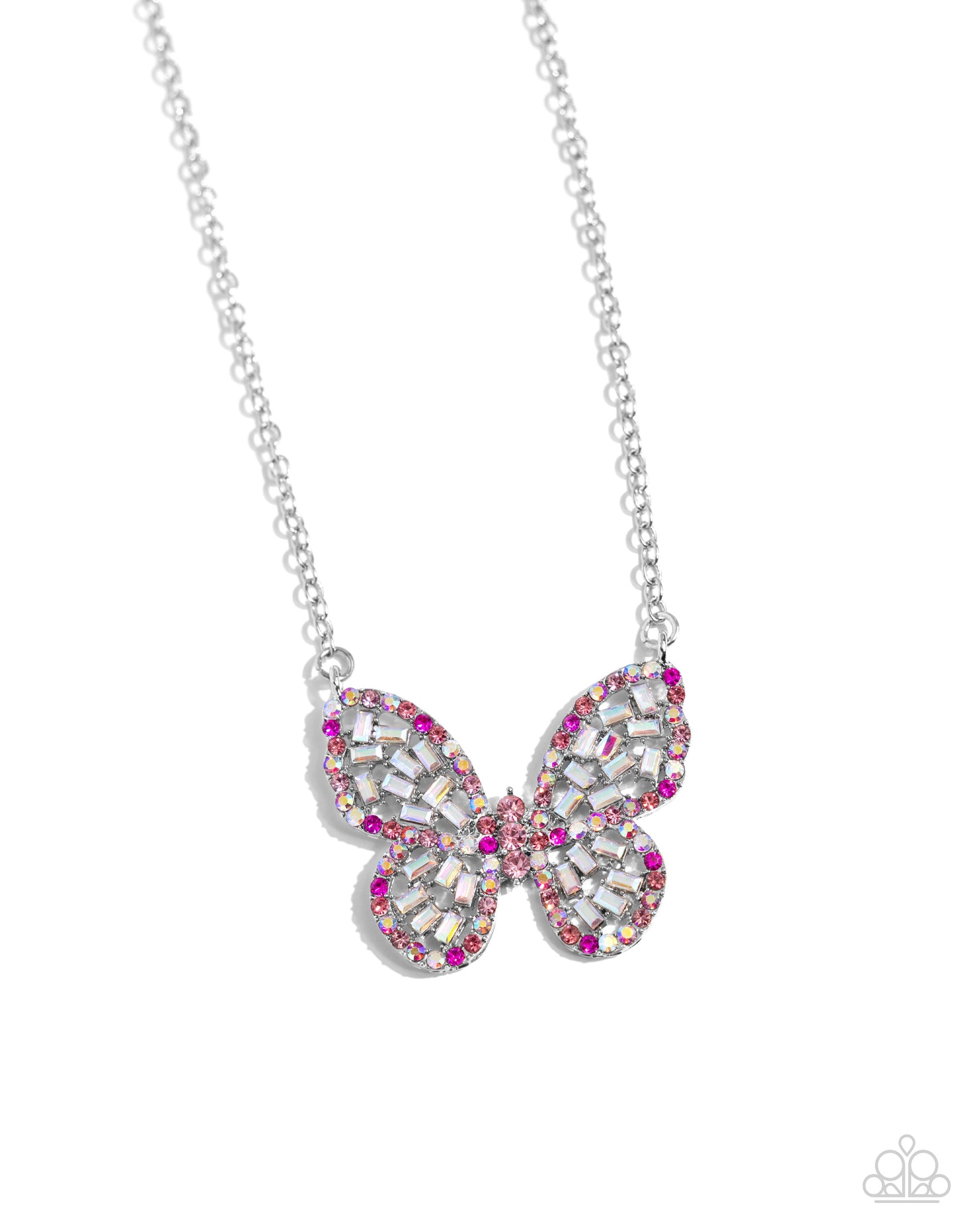 Bordered in pink and iridescent rhinestones, a collection of white emerald-cut dainty gems scatter across the interior of the airy silver butterfly. Additional dainty rose rhinestones create the body of the butterfly for a further splash of color and whimsy. Features an adjustable clasp closure. Due to its prismatic palette, color may vary.