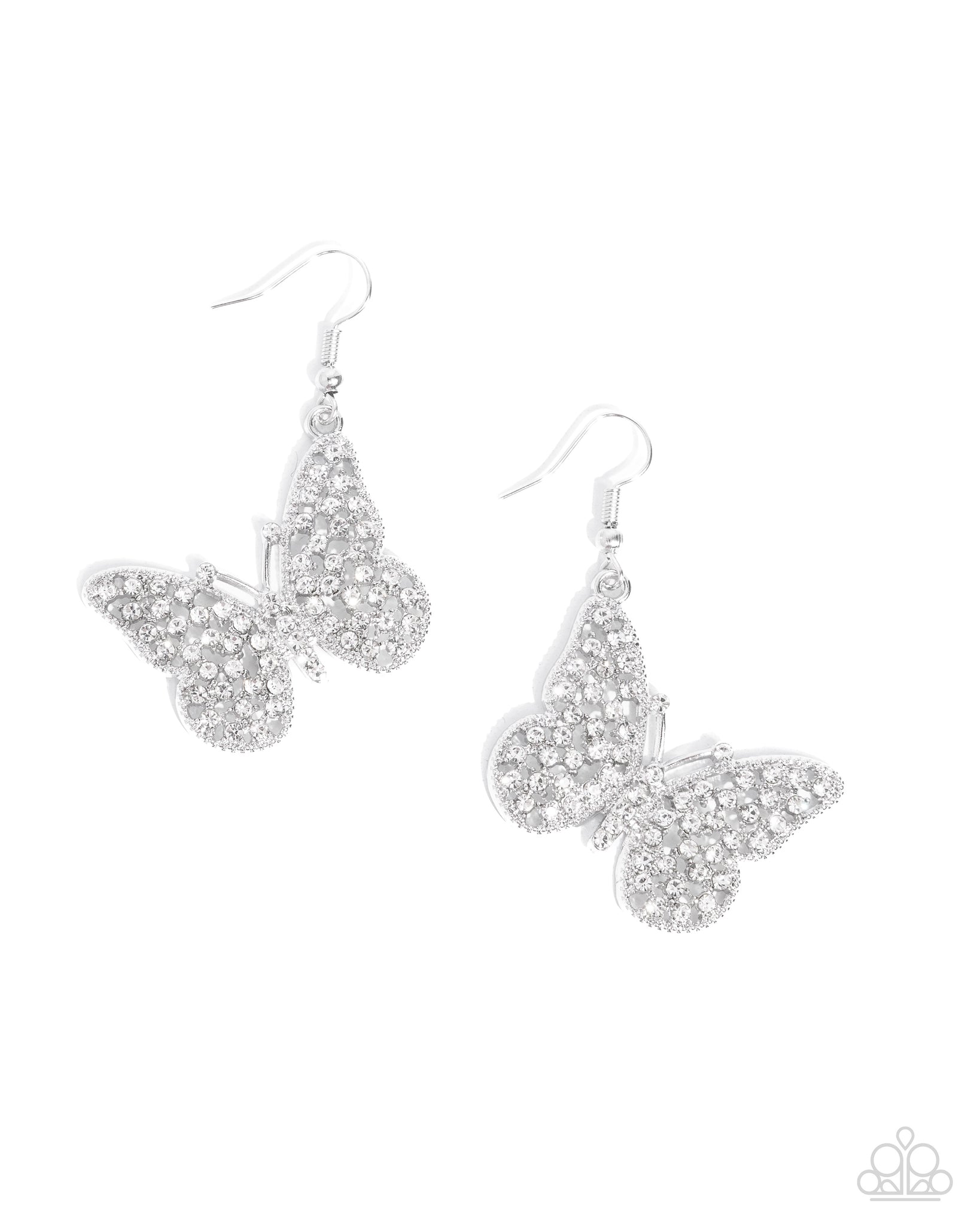 Featuring a scattered motif, an airy silver butterfly encrusted with an explosion of white rhinestones sparkles at the ear for an enchanting fashion. Earring attaches to a standard fishhook fitting.