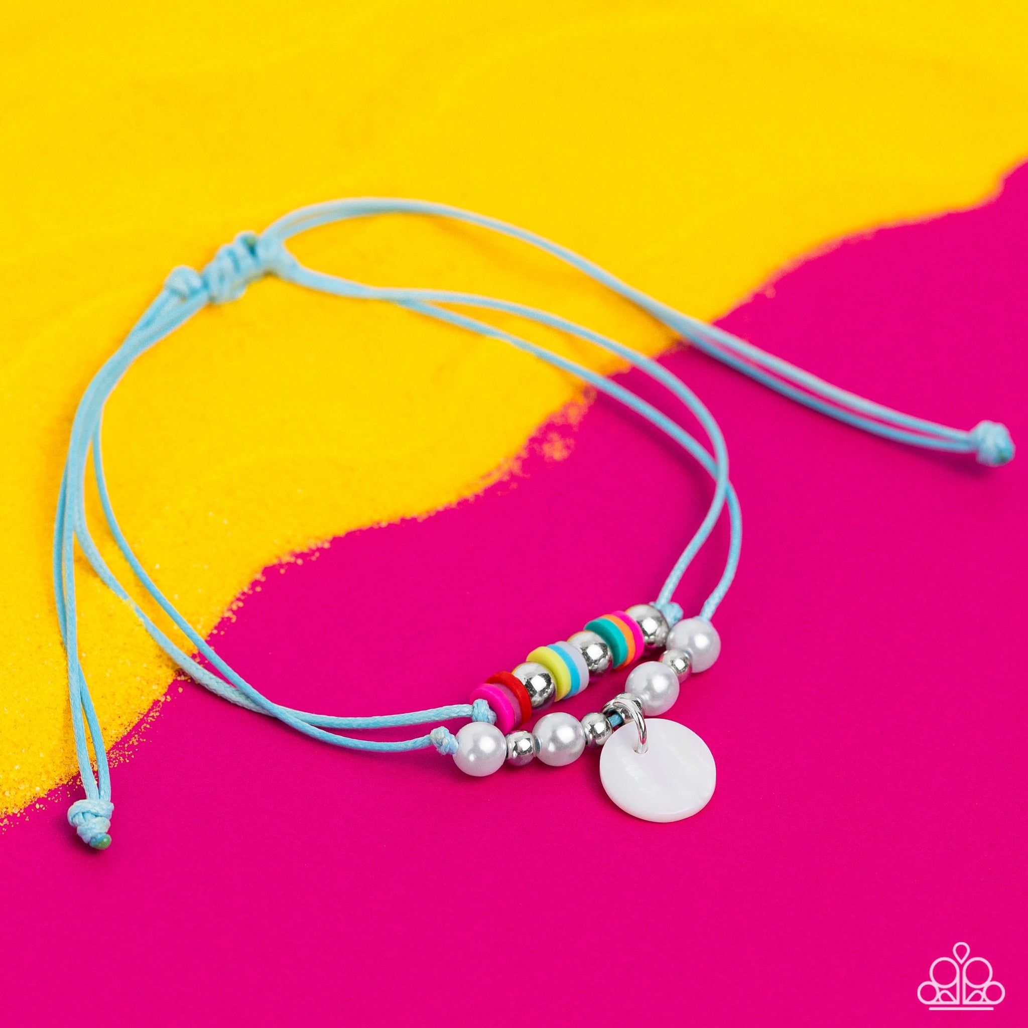 Infused along a light blue string, a coastal collection of pearls, silver studs, multicolored clay discs, and a flat white shell wrap around the ankle for a colorful, seasonal statement. Features an adjustable sliding knot closure.
