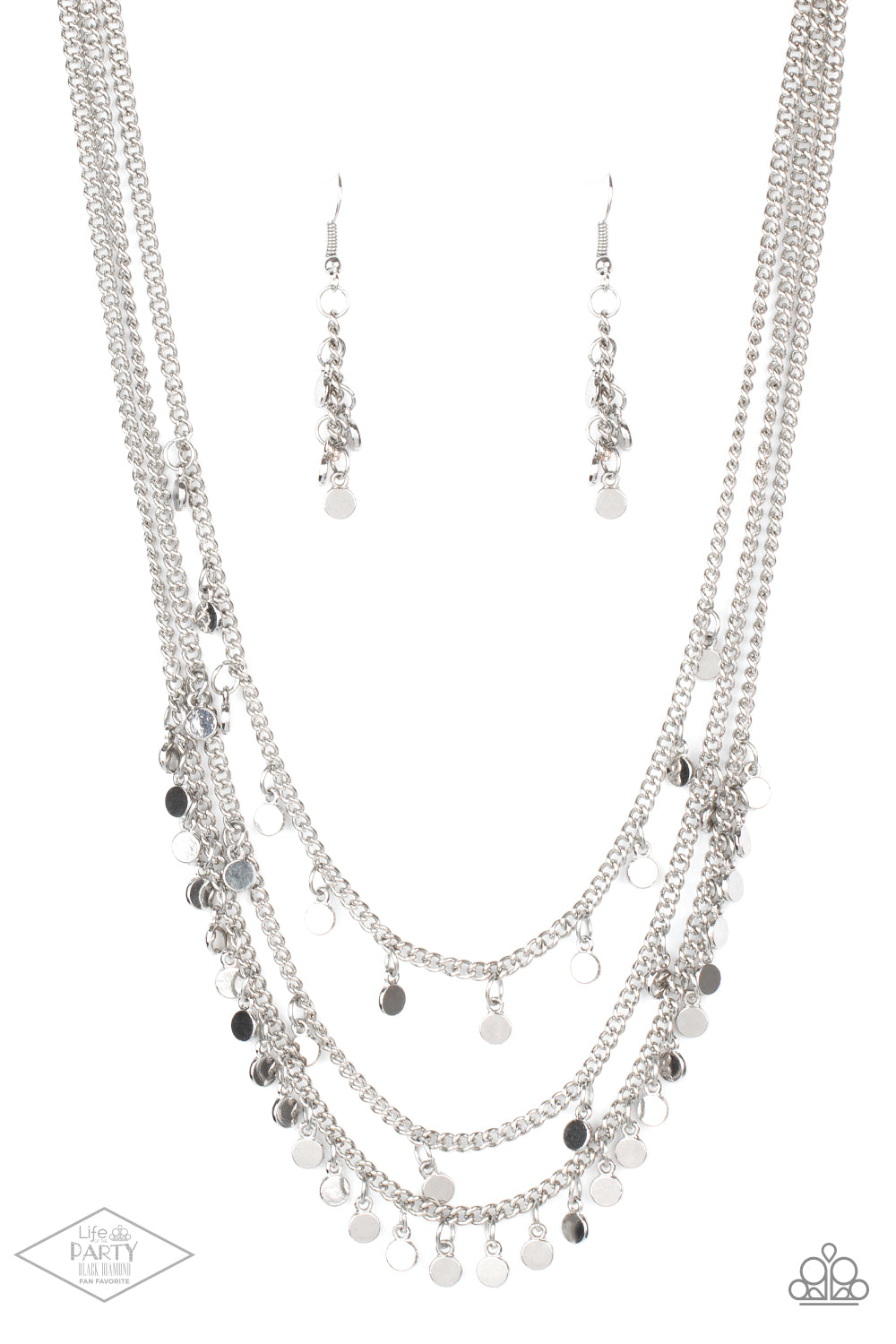 Shiny silver discs swing from three tiers of silver chains. The layered fringe falls just below the collar, creating an endless light-catching texture and movement. Features an adjustable clasp closure.