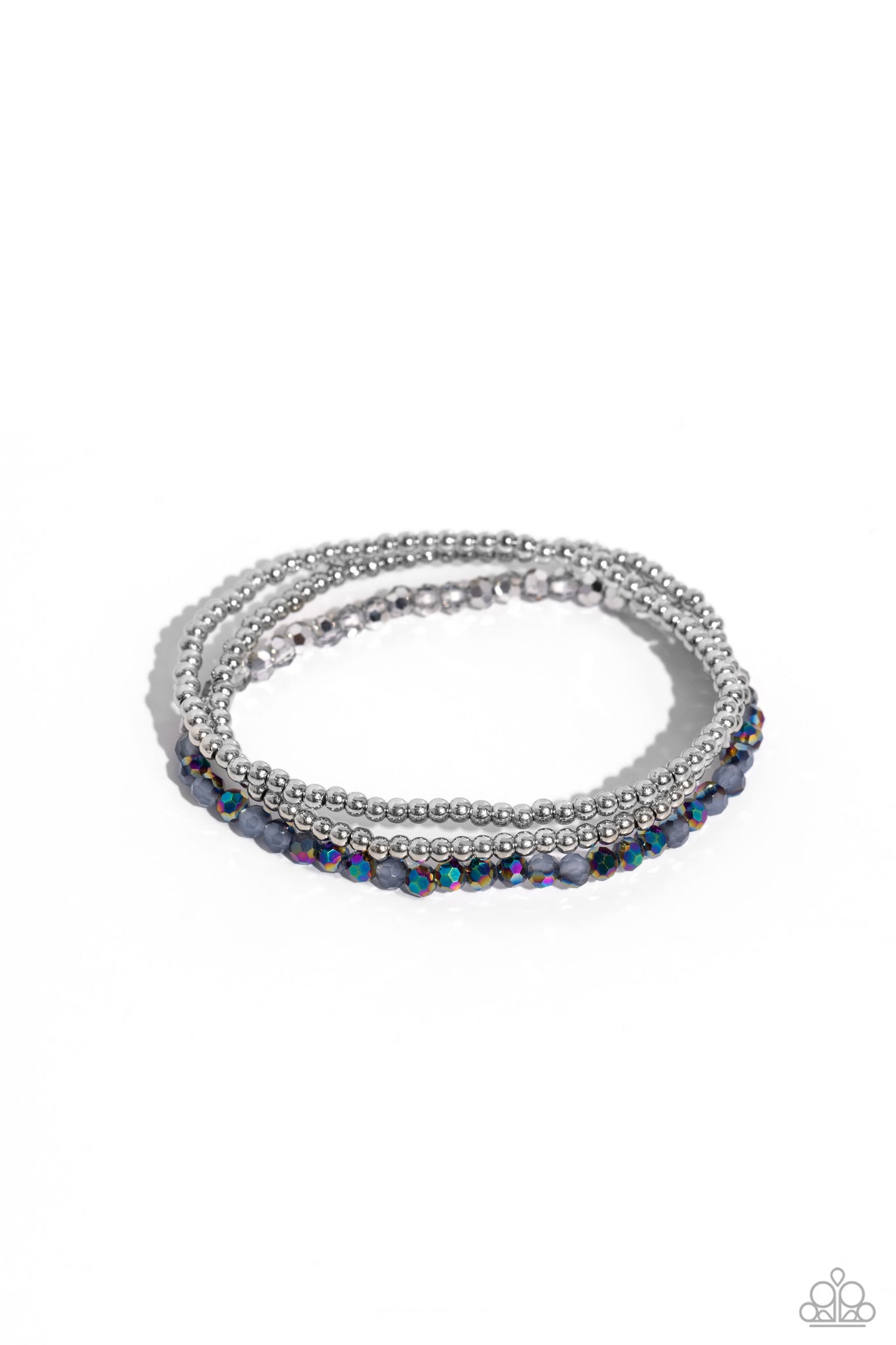 Infused along elastic stretchy bands, a faceted collection of glassy, smoky, silver, and oil spill-flecked crystal-like beads flickers and flashes around the wrist for a noise-making statement. Two strands of dainty silver beads combine with the colored strand, drawing additional interest to the attention-grabbing silver hues.