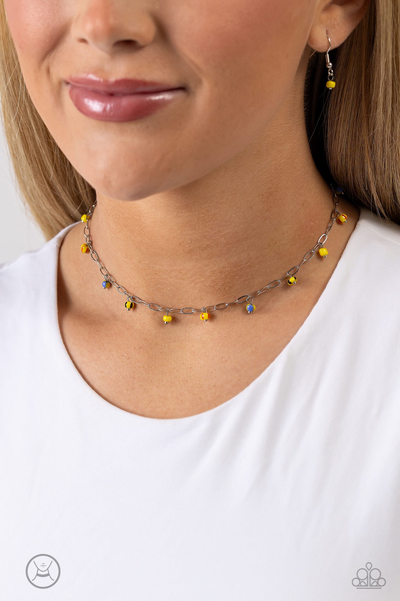 Featuring multicolored spots, bright yellow seed beads dangle along a single dainty silver link chain for a beachy flair. Features an adjustable clasp closure.