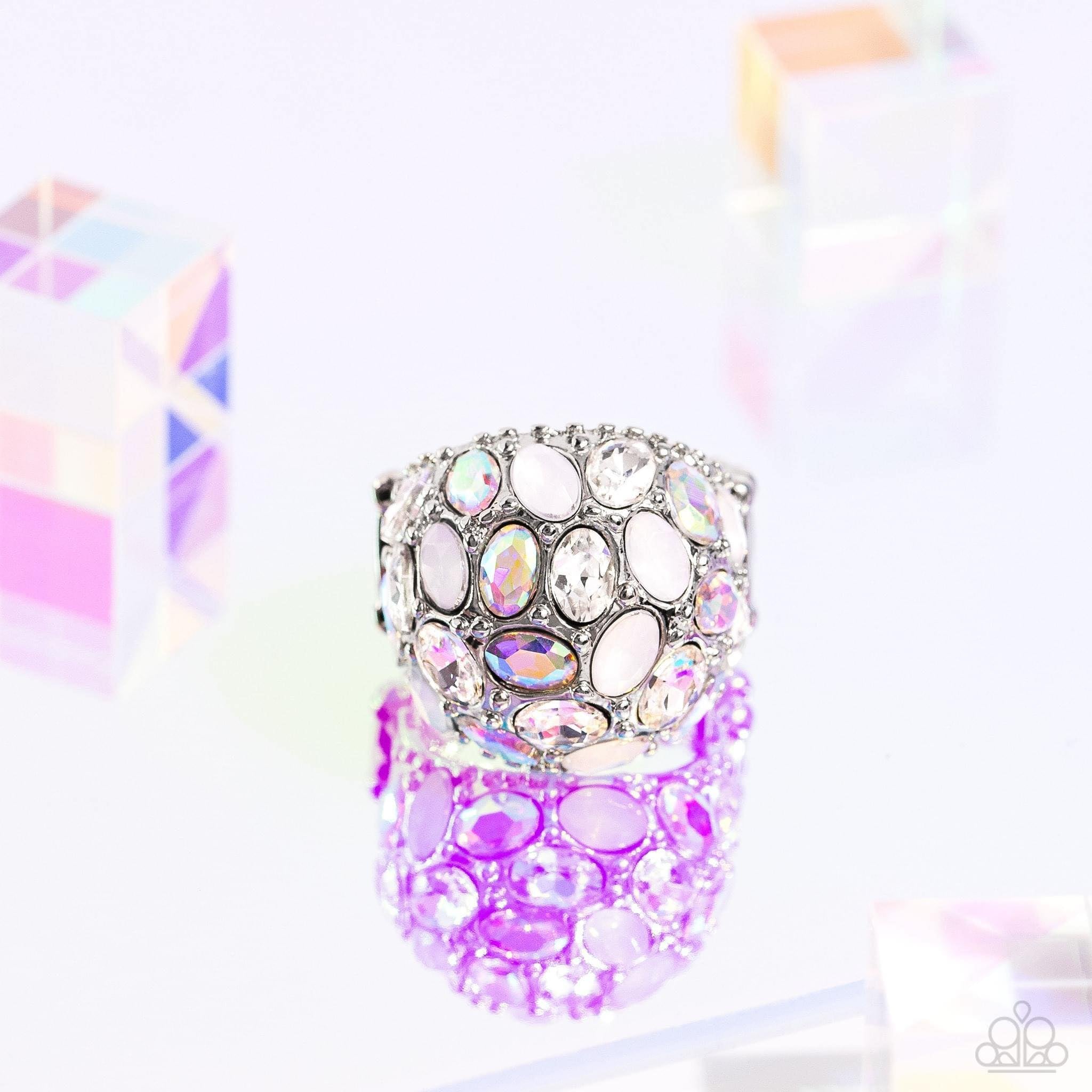 A studded silver frame, filled with blinding oval-cut gems in opalescent, white, and iridescent shades, stands out atop the finger for a blingy statement. Features a stretchy band for a flexible fit. Due to its prismatic palette, color may vary.
