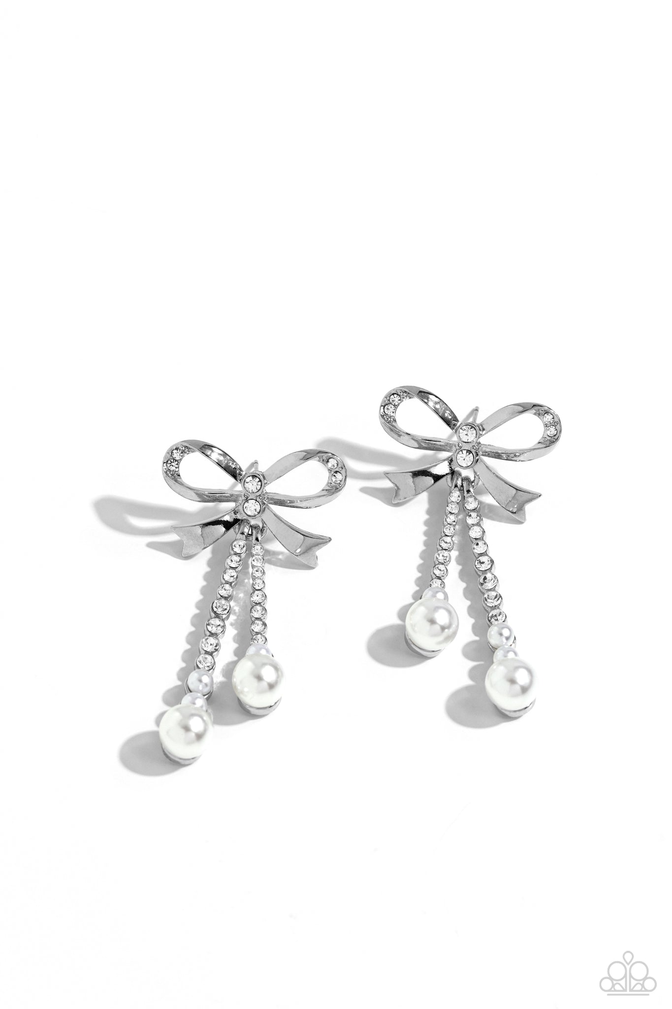 Adorned in sparkling white rhinestones, high-sheen bands of silver curl and loop into a stunning bow charm, creating a classy statement at the ear. White rhinestones encased in scalloped silver fittings, featuring white pearls that slowly increase in size dangle from the bow charm adding a refined tassel to the stunning display. Earring attaches to a standard post fitting.