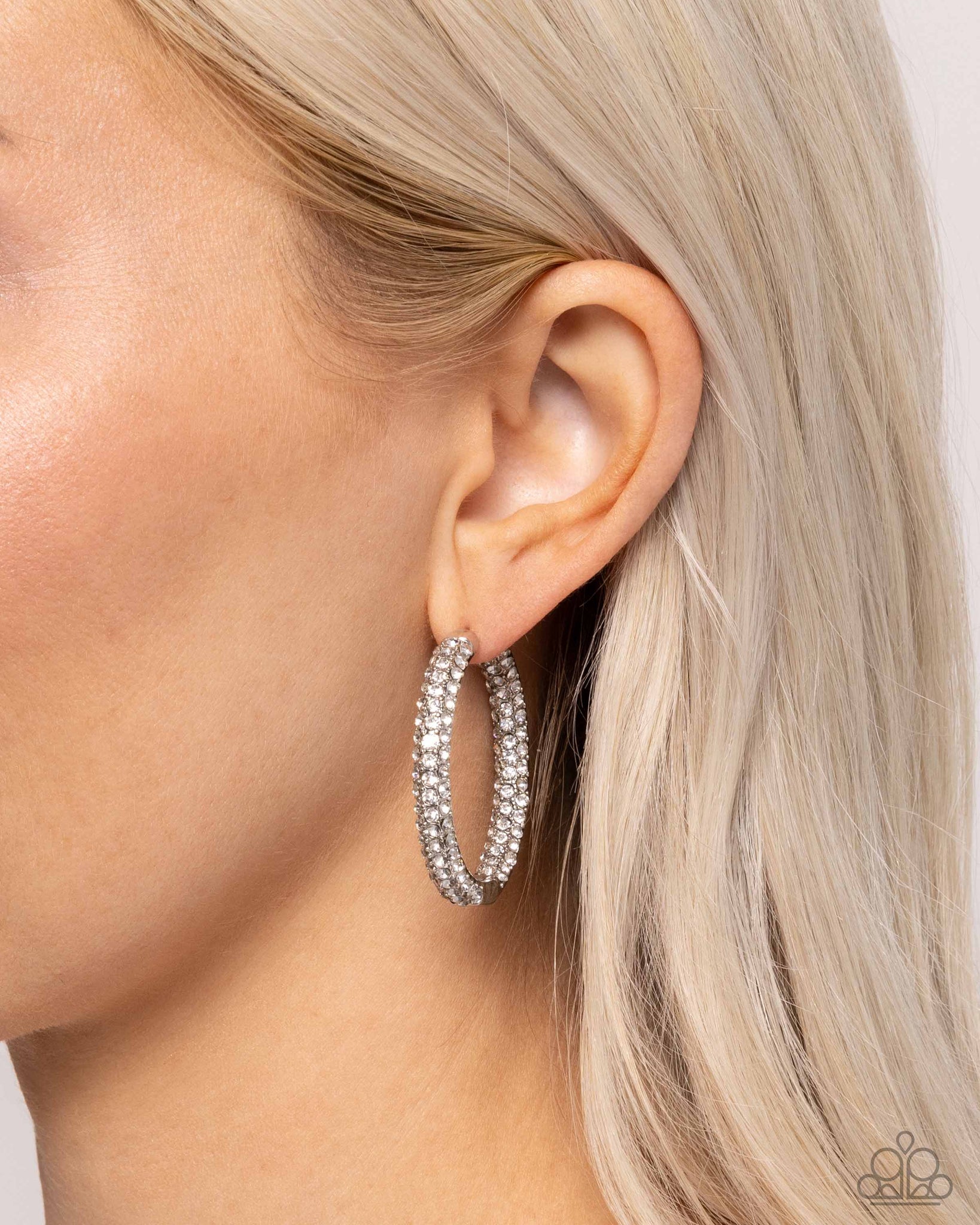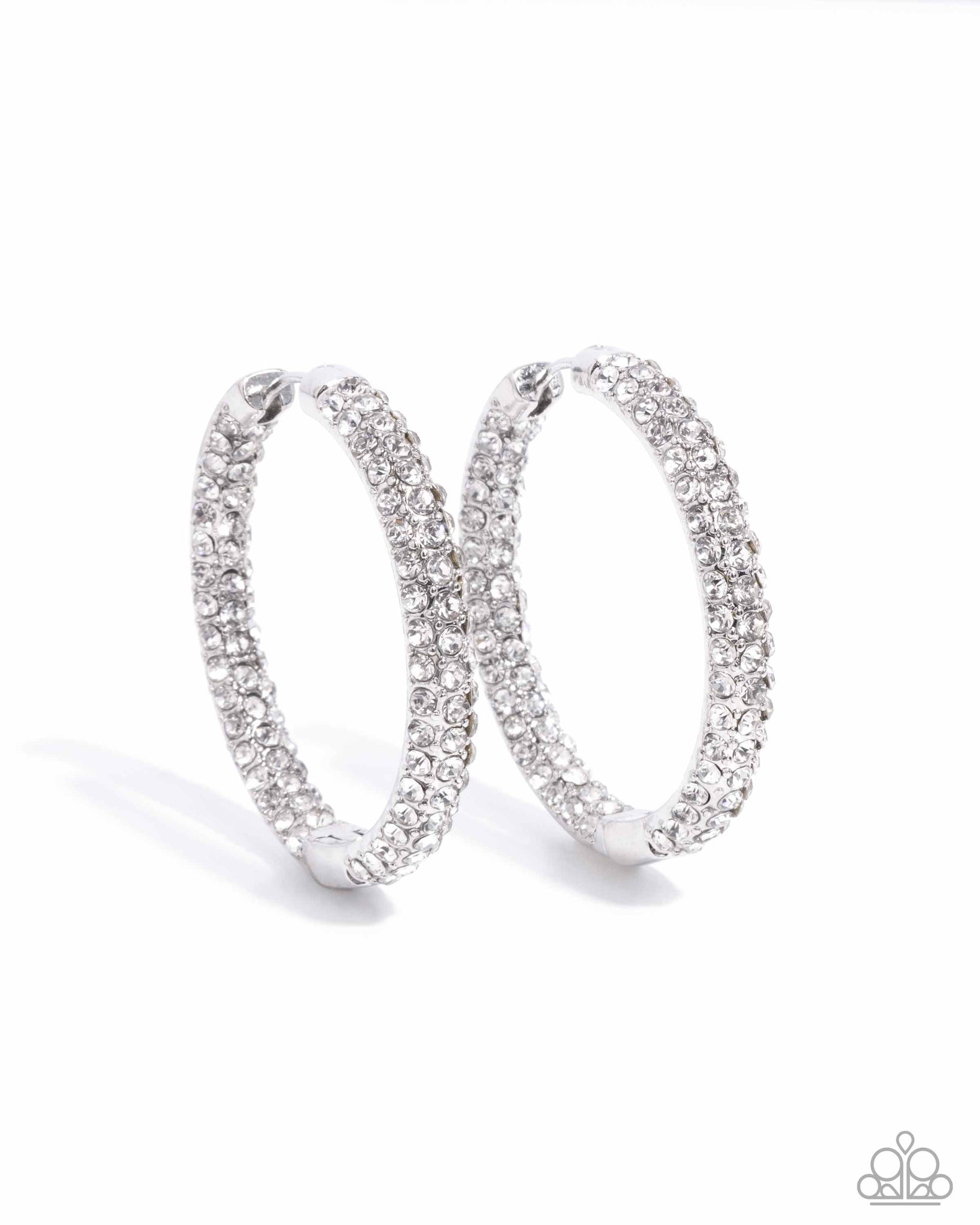 Embellished along the outer and inner edges of a glistening silver hoop, white rhinestones glimmer along the ear for a shimmery statement. Earring attaches to a standard hinge closure fitting. Hoop measures approximately 1 1/2" in diameter.
