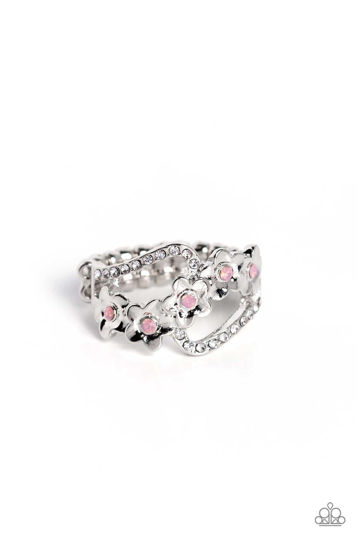 A row of sleek silver daisies with pink opalescent centers curls up the finger for a whimsical floral arrangement. Curls of silver dotted with dainty white rhinestones frames the floral display for additional subtle color. Features a dainty stretchy band for a flexible fit.