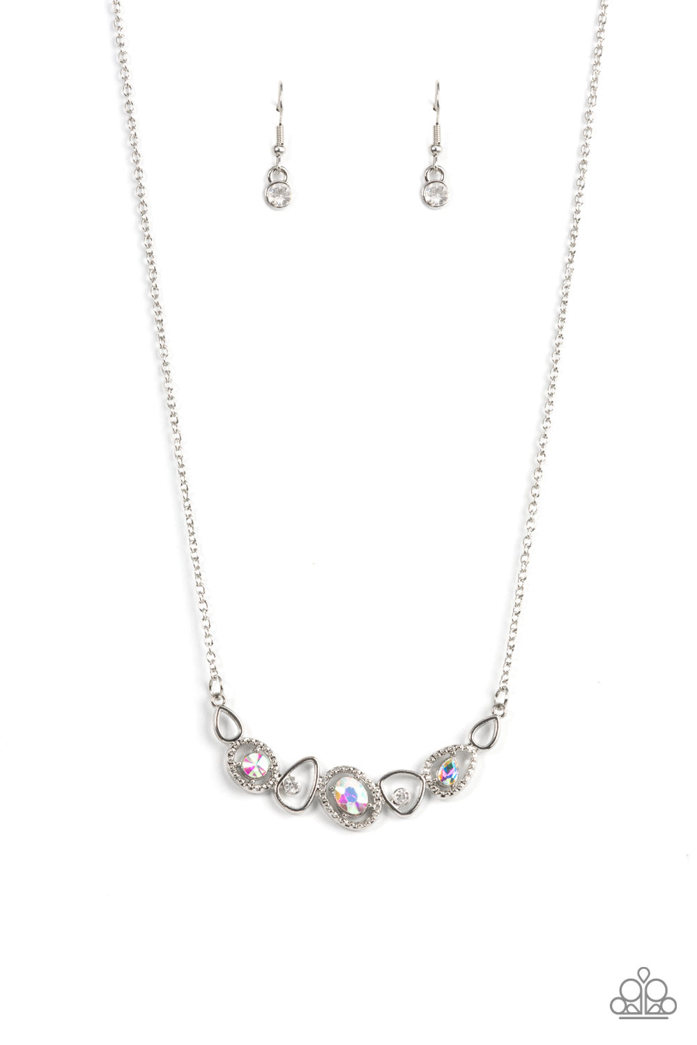 An incandescent assortment of shiny silver frames, dainty white rhinestones, and oversized iridescent gems delicately coalesce into a statement-making sparkle below the collar. Features an adjustable clasp closure.