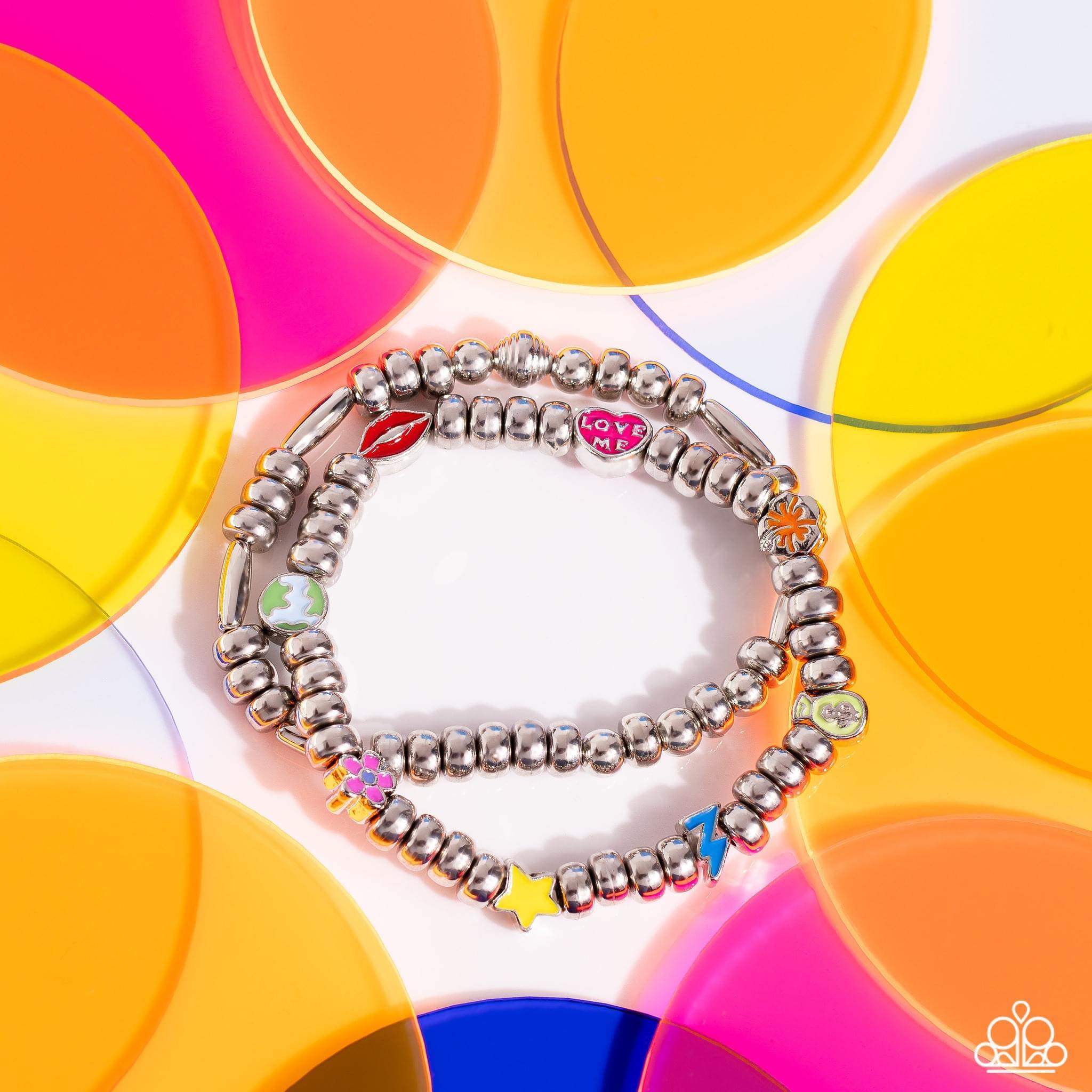 A strand of textured, cylindrical, and round high-sheen silver beads combine with a single strand of silver beads, sporadically infused with vivacious charm beads to create an energetic stack of stretchy bracelets. The colorful beaded stack features a yellow star, blue lightning bolt, green money bag, orange tropical flower, red lips, blue and green earth, pink and purple flower, and a pink heart charm with the words "love me" for a youthful finish.