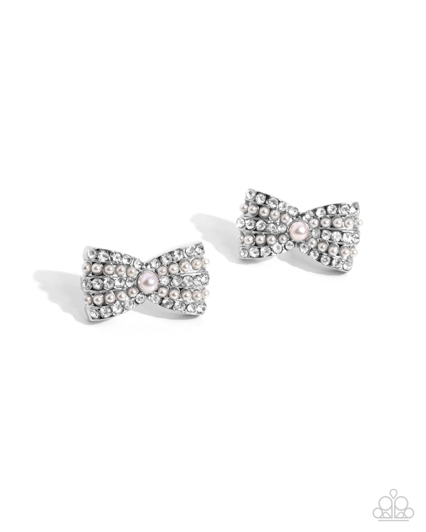 Featuring rows of glistening white rhinestones and baby pink pearls, an airy silver bow is embellished atop the ear from a baby pink pearly center for a dramatically dazzling finish. Earring attaches to a standard post fitting. Sold as one pair of post earrings.
