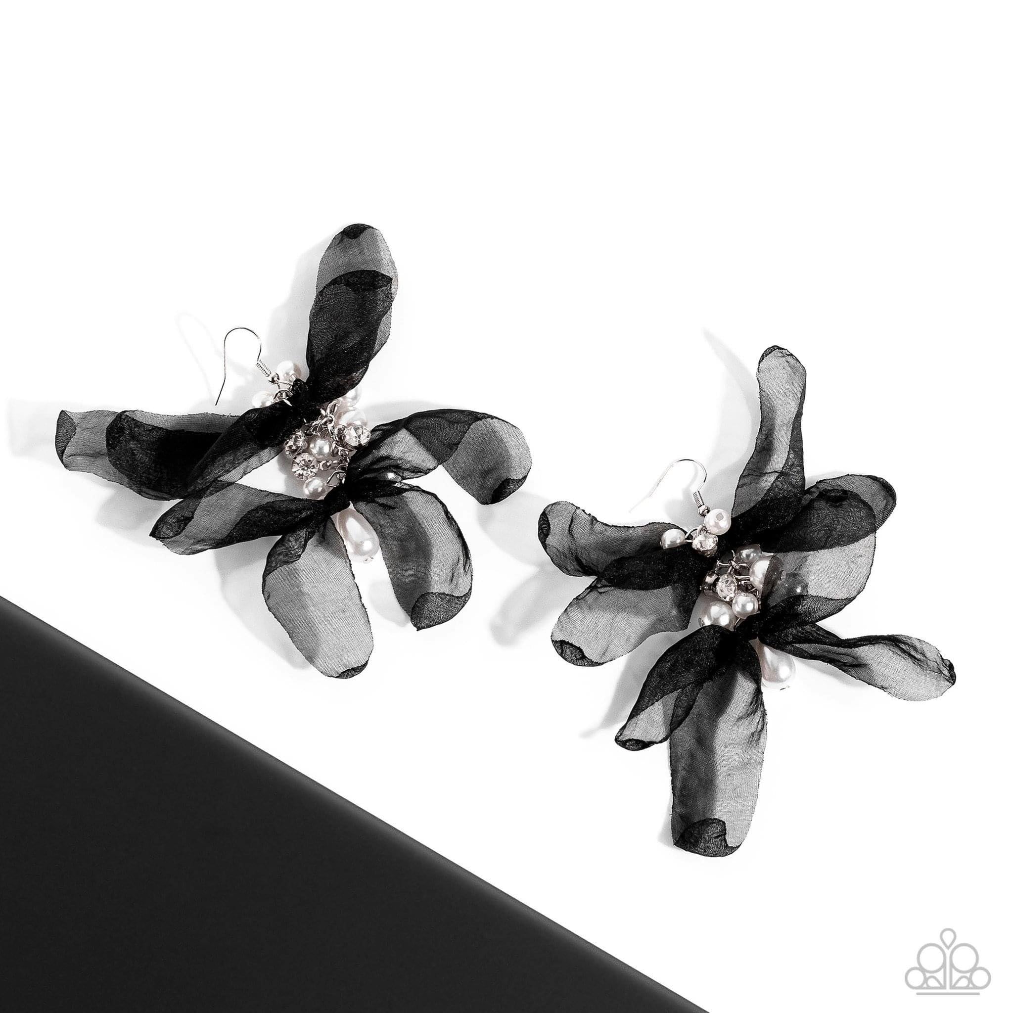 Featuring a layered motif, elongated black silk petals are separated by a sprinkle of white gems in silver fittings that mingle with a cluster of dreamy white pearls, creating a high-society fringe. Earring attaches to a standard fishhook fitting.