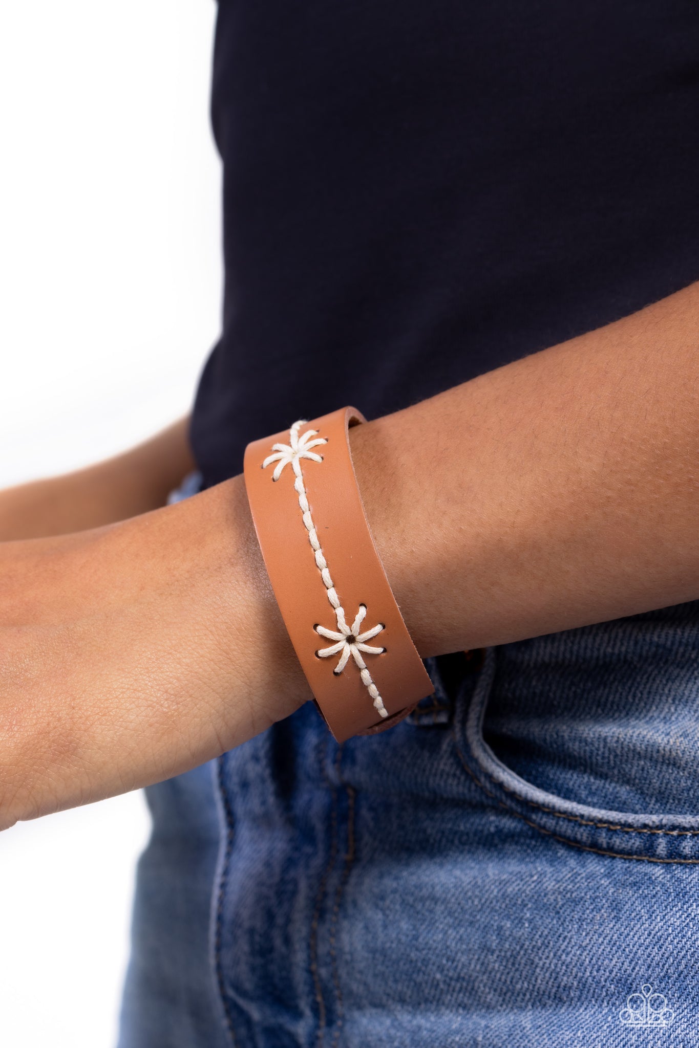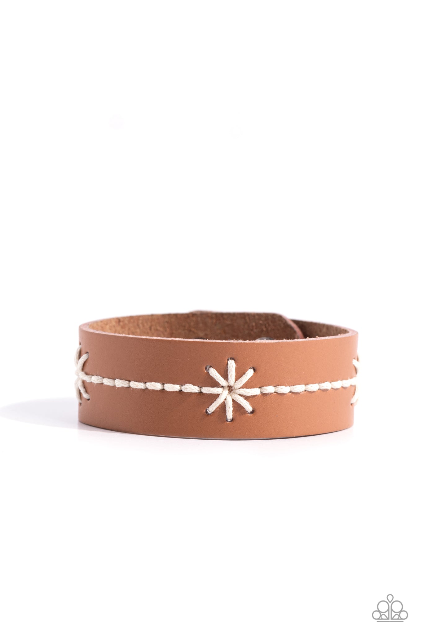 Rustic white cording is stitched across the front of a brown leather band, adding charming floral inspired motifs to the rustic centerpiece. Features an adjustable clasp closure.