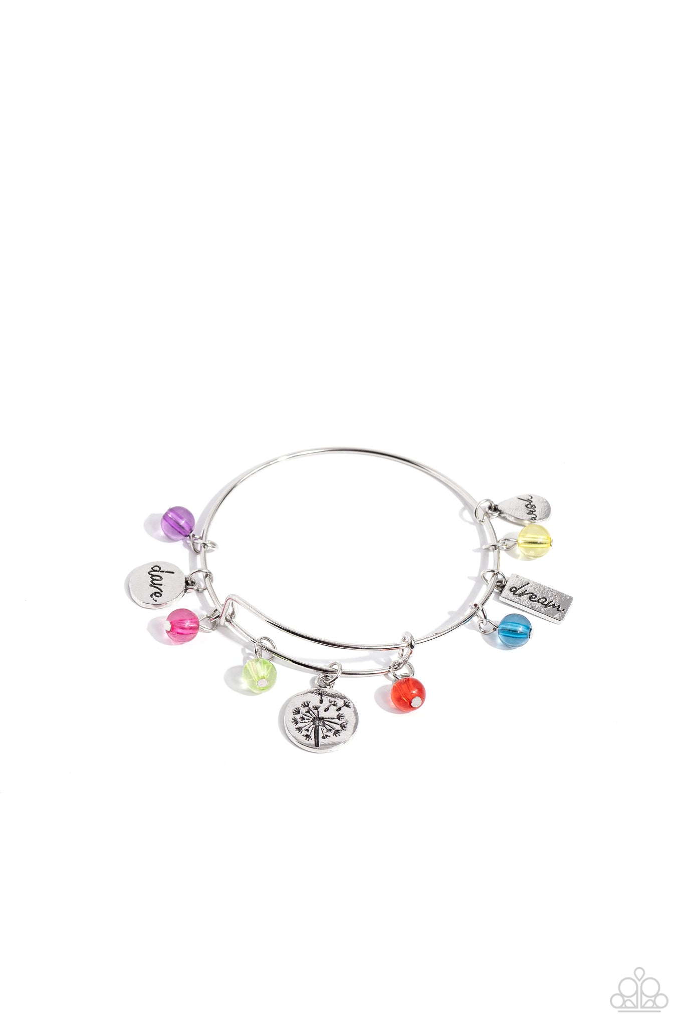 A collection of various shimmery silver discs, each featuring the stamped words "dare," "wish," and "dream," combines with clear, glassy apple green, orange, turquoise, yellow, purple, and hot pink beads as they slide along a sleek bar fitting, on a dainty silver bangle. A larger disc, stamped with a dandelion motif finishes off the charming design with a sentimental statement.