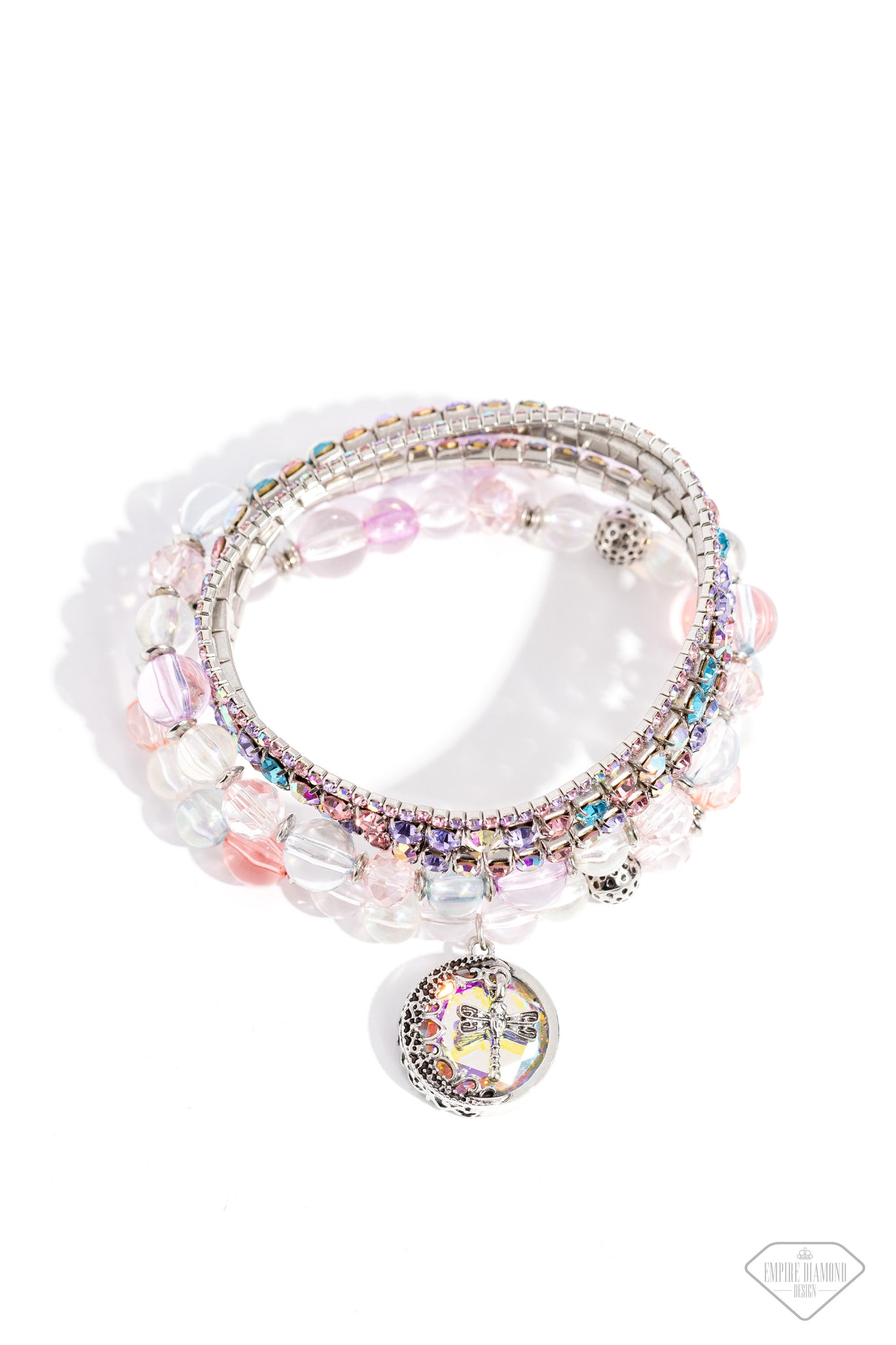 A mismatched assortment of bubbly multicolored beads joins pink crystal-like beads, silver accents, and silver-dotted beads along elastic stretchy bands around the wrist. Pressed in silver square fittings, three strands of iridescent, pink, blue, and purple rhinestones are added to the stack, resulting in dreamy layers. Dancing from one of the bubbly strands, a thick oval pendant with a faceted iridescent center, cutout silver filigree, and a dot-motif border displays an intricate dragonfly charm for an elegantly earthy finish. Due to its prismatic palette, color may vary.