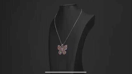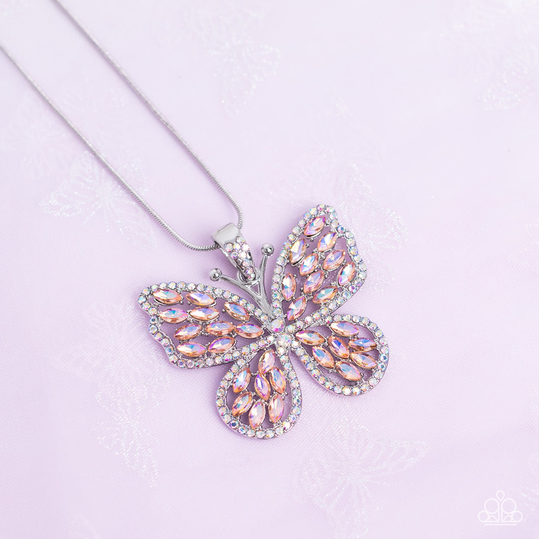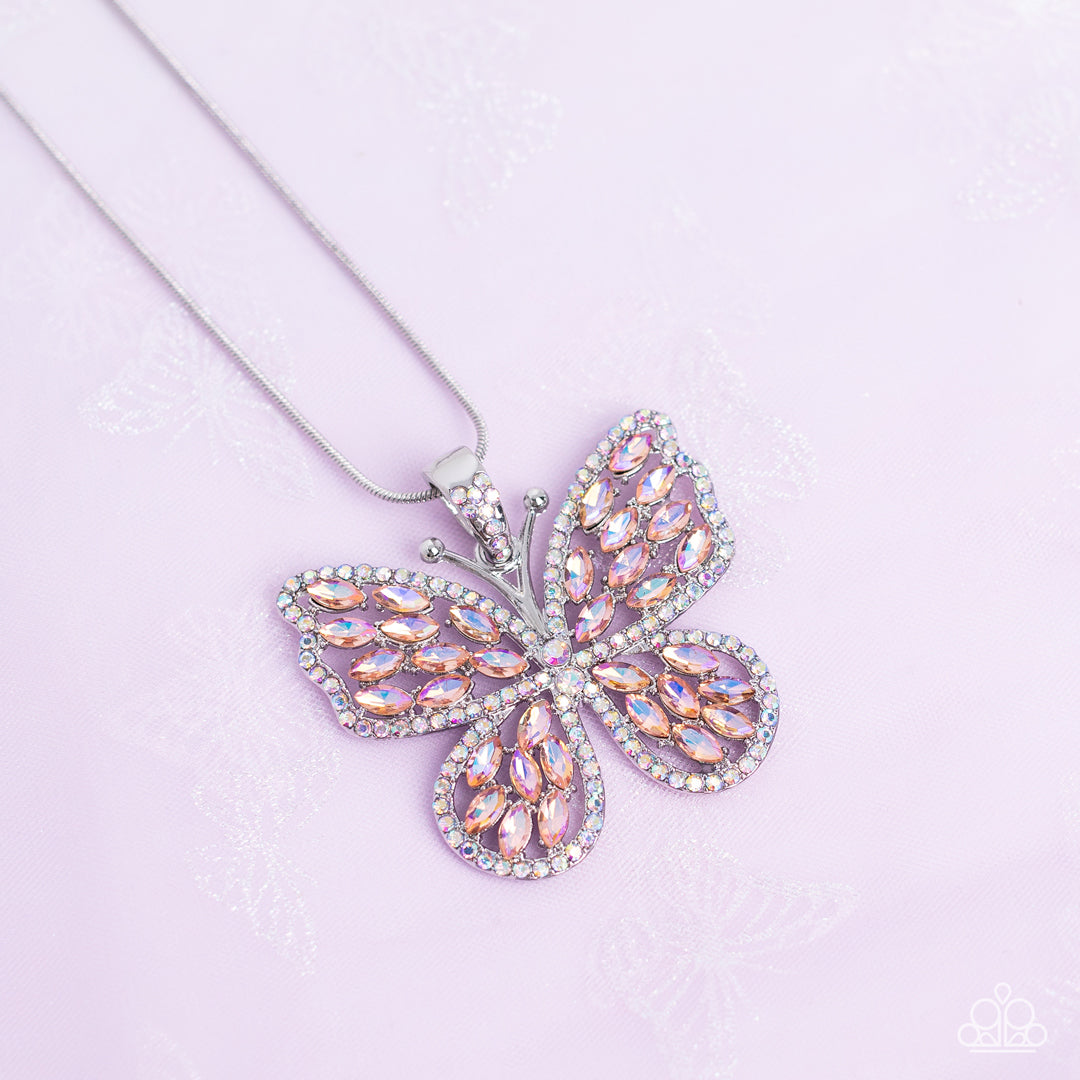 Dotted in iridescent orange marquise-cut rhinestones, an airy whimsical silver butterfly flutters along a dainty silver snake chain below the collar in an enchanting fashion. Dainty white iridescent rhinestones glitz across the top of the pendant and the frame of the butterfly, accentuating the dazzling kaleidoscope of color within the wings. Features an adjustable clasp closure. Due to its prismatic palette, color may vary.