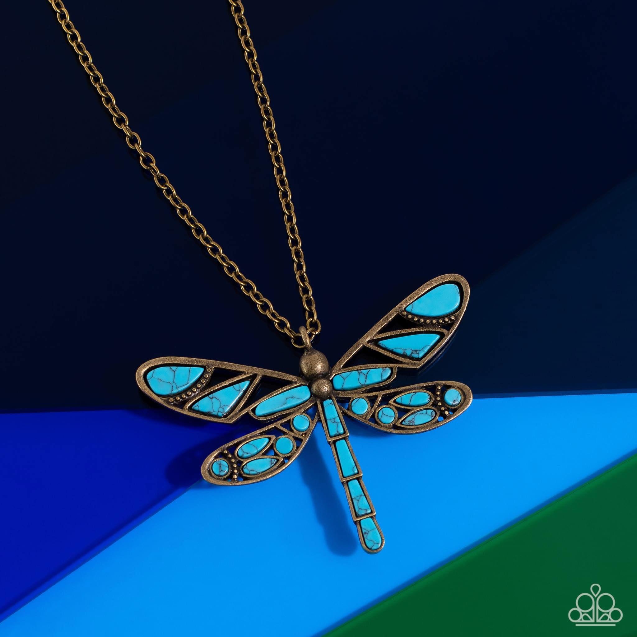 Featuring a classic brass chain, various cuts of turquoise stone are passed into an oversized, airy brass dragonfly pendant for a rustically earthy centerpiece. Features an adjustable clasp closure. As the stone elements in this piece are natural, some color variation is normal.