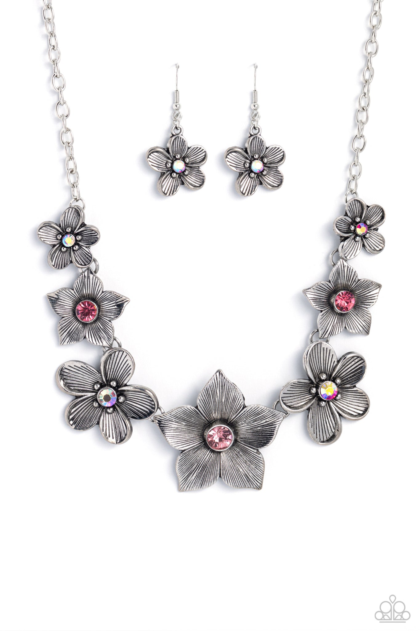 Peaked and rounded tactile silver flowers alternate as they gradually increase in size towards the center of the collar on a classic silver link chain. The rounded flowers feature iridescent pink gem centers while the peaked flowers feature various pink gem centers for a whimsical array of glitz. The rounded flowers also feature a border of studs around its center for a subtle industrial finish. Features an adjustable clasp closure. Due to its prismatic palette, color may vary.