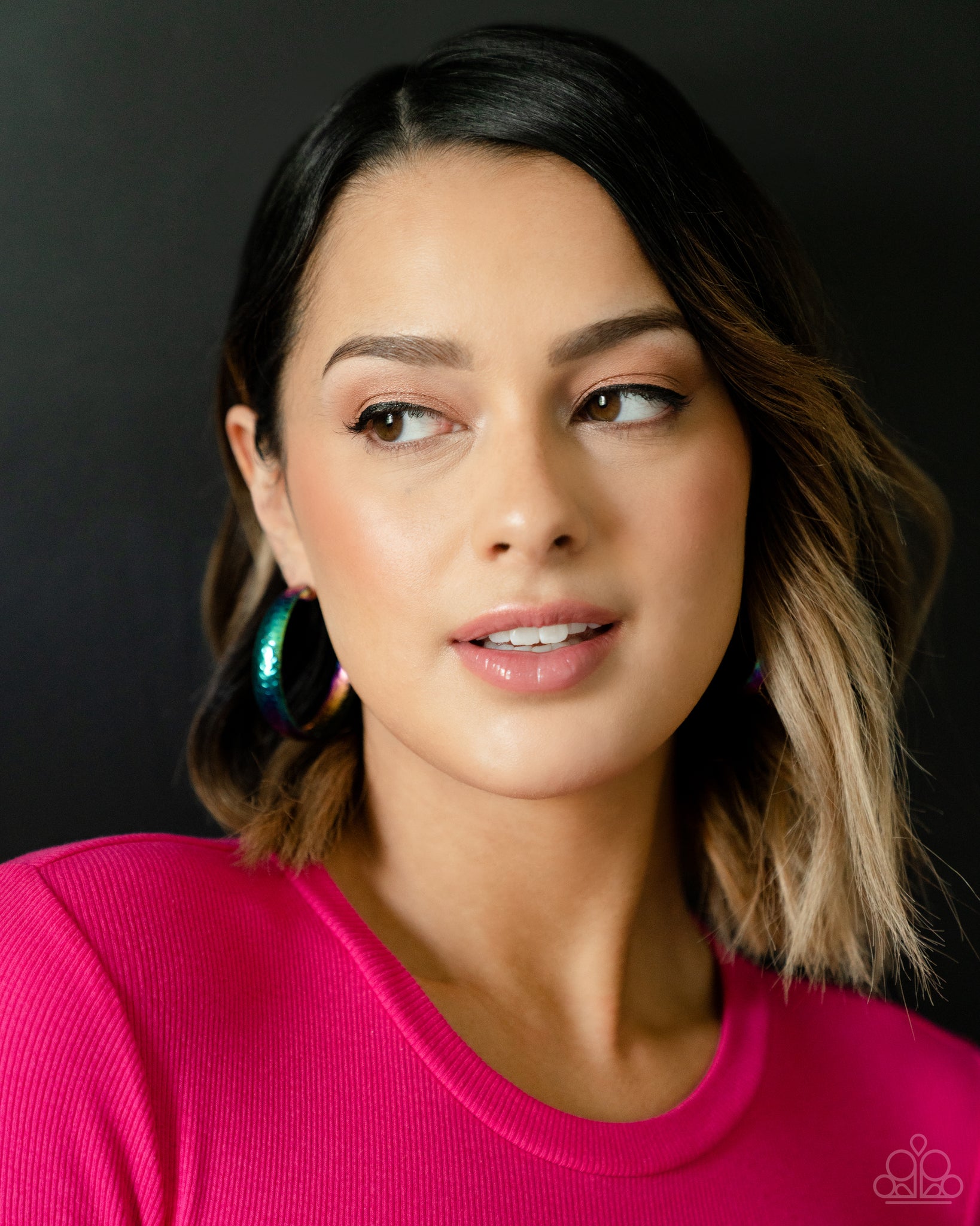 Radiating with hammered detail, an oil-spill finished hoop curls around the ear for a look ahead of its time. Earring attaches to a standard post fitting. Hoop measures approximately 1.75" in diameter.