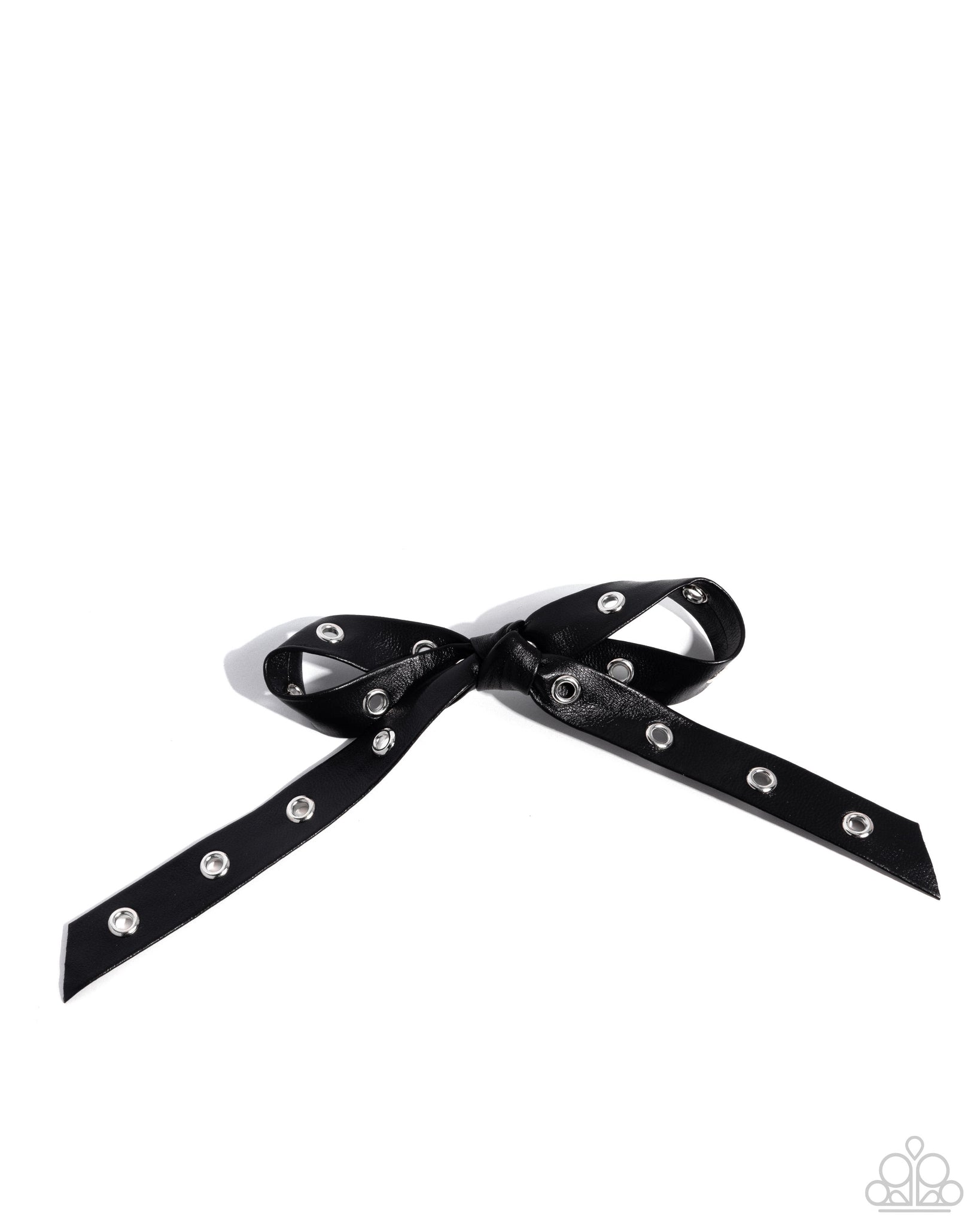 A sleek black leather bow is adorned with silver grommets, adding a touch of edgy flair to the design. Features a standard hair clip on the back.