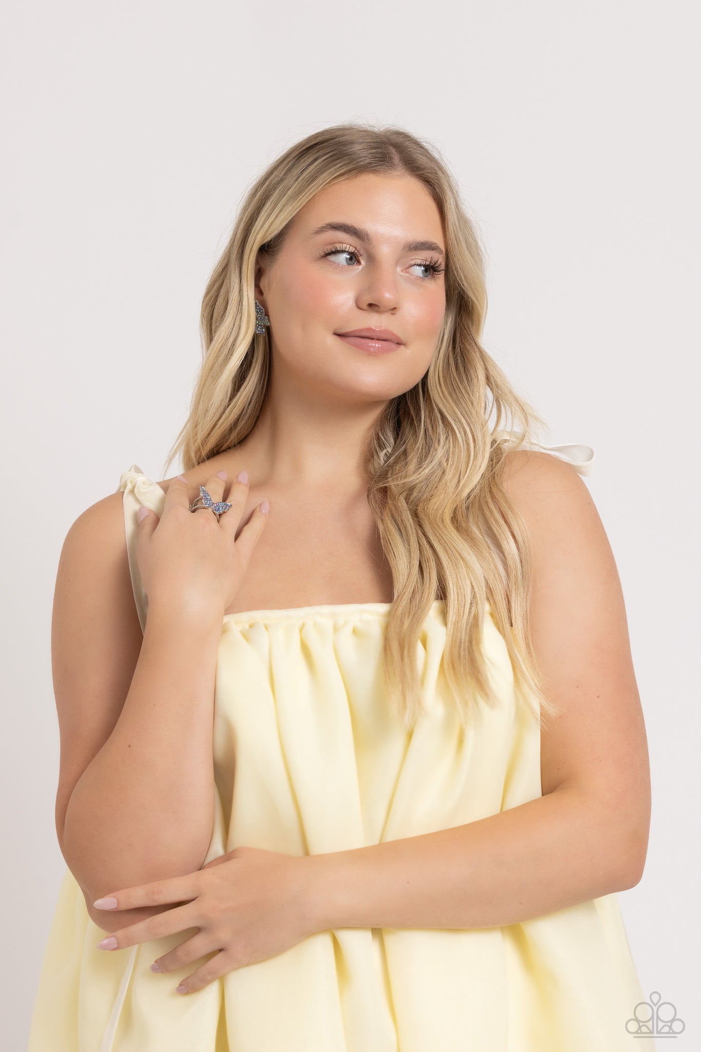 Featured atop airy silver bands, a silver butterfly encrusted with an explosion of blue iridescent rhinestones sparkles at the finger for an enchanting fashion. Features a stretchy band for a flexible fit. Due to its prismatic palette, color may vary.
