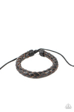 Rustically braided leather laces delicately spin into a boldly woven band around the wrist. Features an adjustable sliding knot closure.