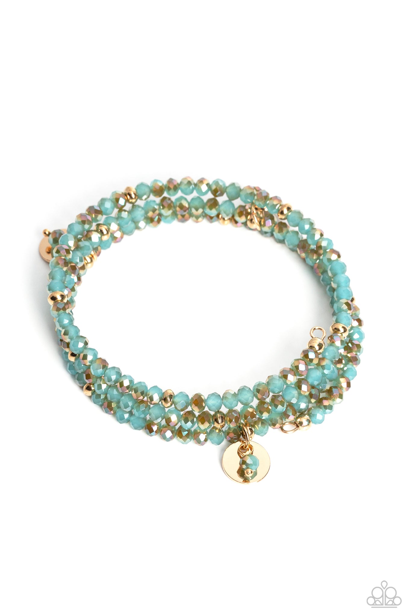 A dazzling collection of blue beads brushed with a golden undertone, gold studs, and gold discs are threaded along a coiled wire, creating a blinding infinity wrap style bracelet around the wrist.