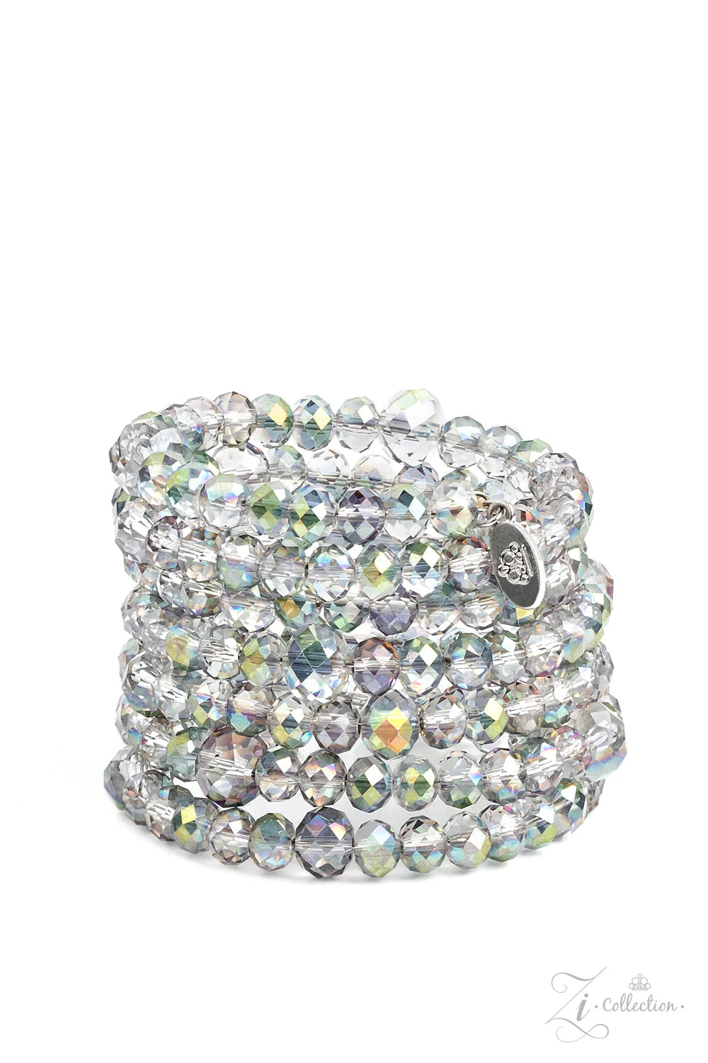 Countless clear, crystal beads are threaded along a coiled wire, creating an infinity wrap bracelet. Each faceted edge of the beads is brushed in a dreamy, reflective, colorful finish that flickers and flashes at every turn. Due to its prismatic palette, color may vary.