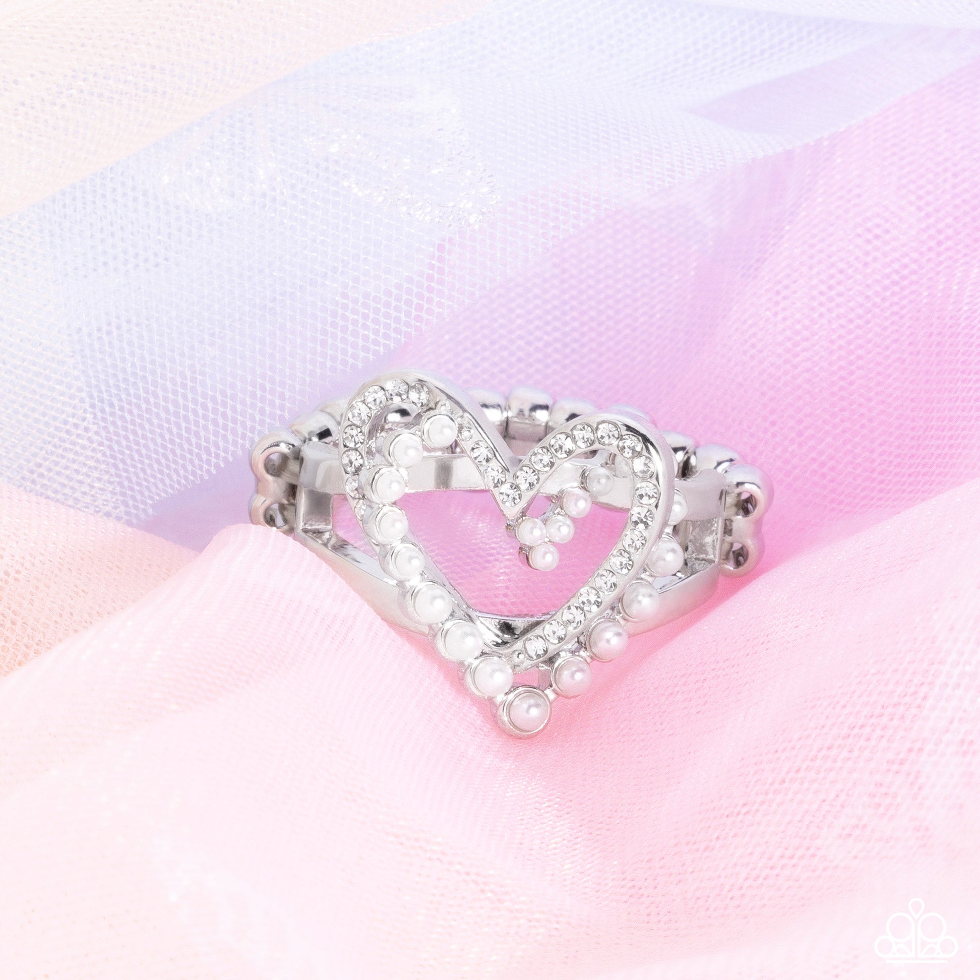 Featuring glossy white pearls and glittery white rhinestones, two silver hearts interlock and flair atop the finger between airy silver bands for a timelessly twisted look. Features a dainty stretchy band for a flexible fit.