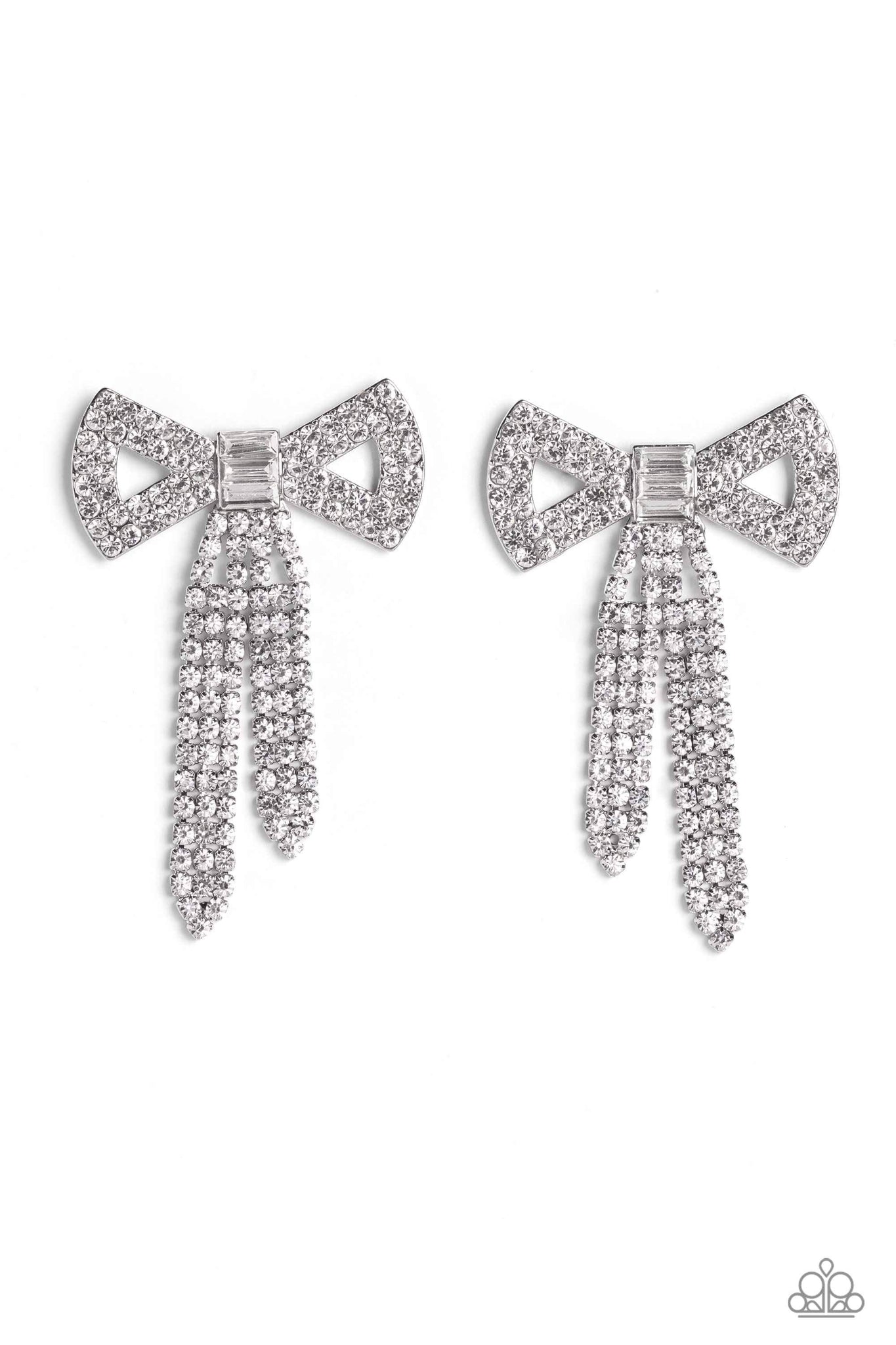 Featuring silver square fittings, high-sheen bands of silver, adorned in sparkling white rhinestones loop into a stunning bow charm, creating a classy statement at the ear. Featured in the center of the classy design, a trio of emerald-cut white gems tie the bow together emitting further sheen and glitz. Earring attaches to a standard post fitting.