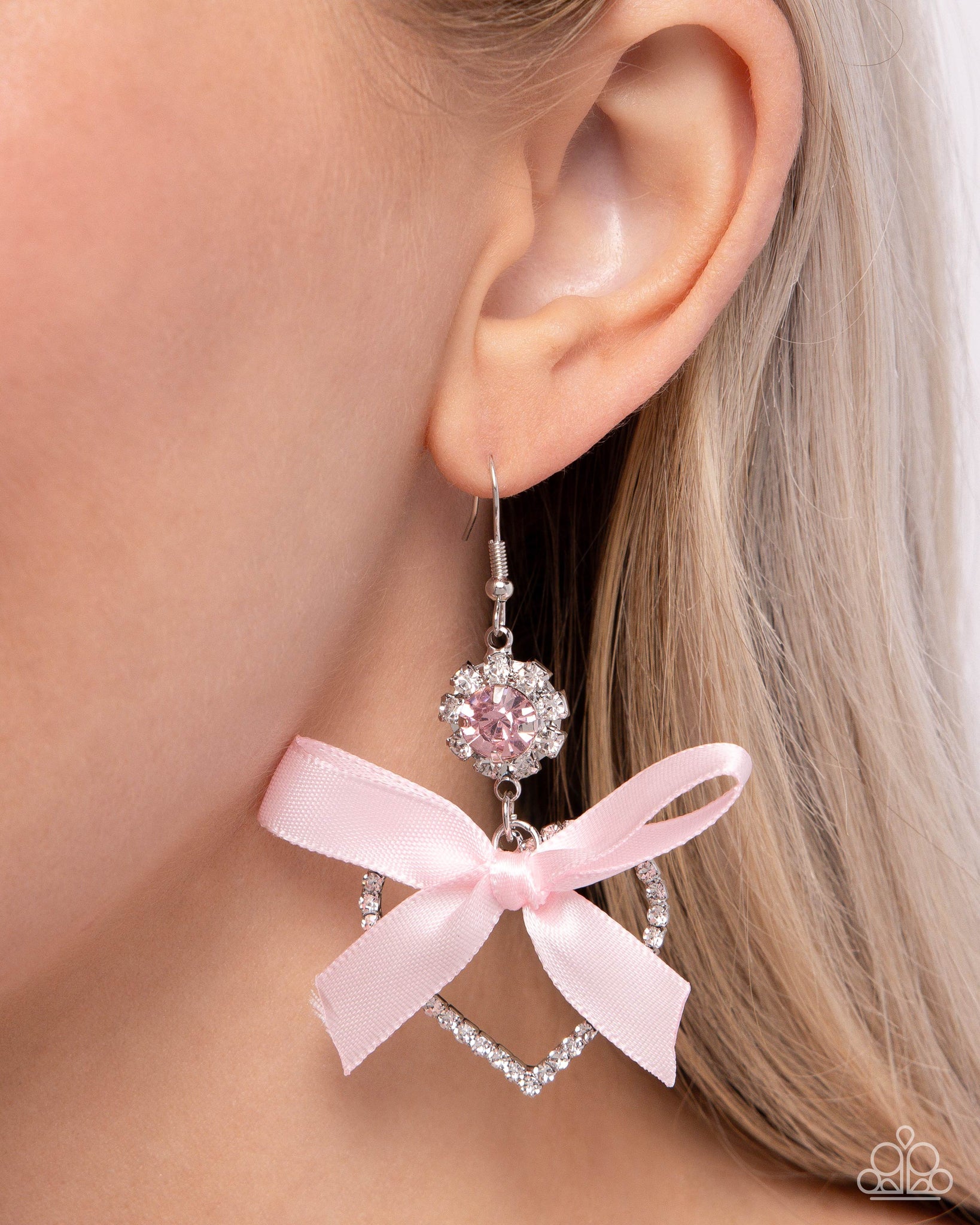 Pressed in a silver-pronged, white rhinestone-embellished sunburst frame, a light rose gem gives way to a white rhinestone-embellished heart frame for a regally romantic look. A baby pink satin ribbon is tied in between the two glittery frames for additional refinement. Earring attaches to a standard fishhook fitting.