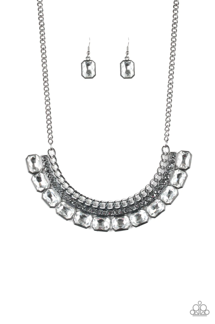 Stationary rows of shimmery gunmetal chain, glittery hematite rhinestones, and glassy white emerald-cut gems coalesce into a bold pendant below the collar. Features an adjustable clasp closure.