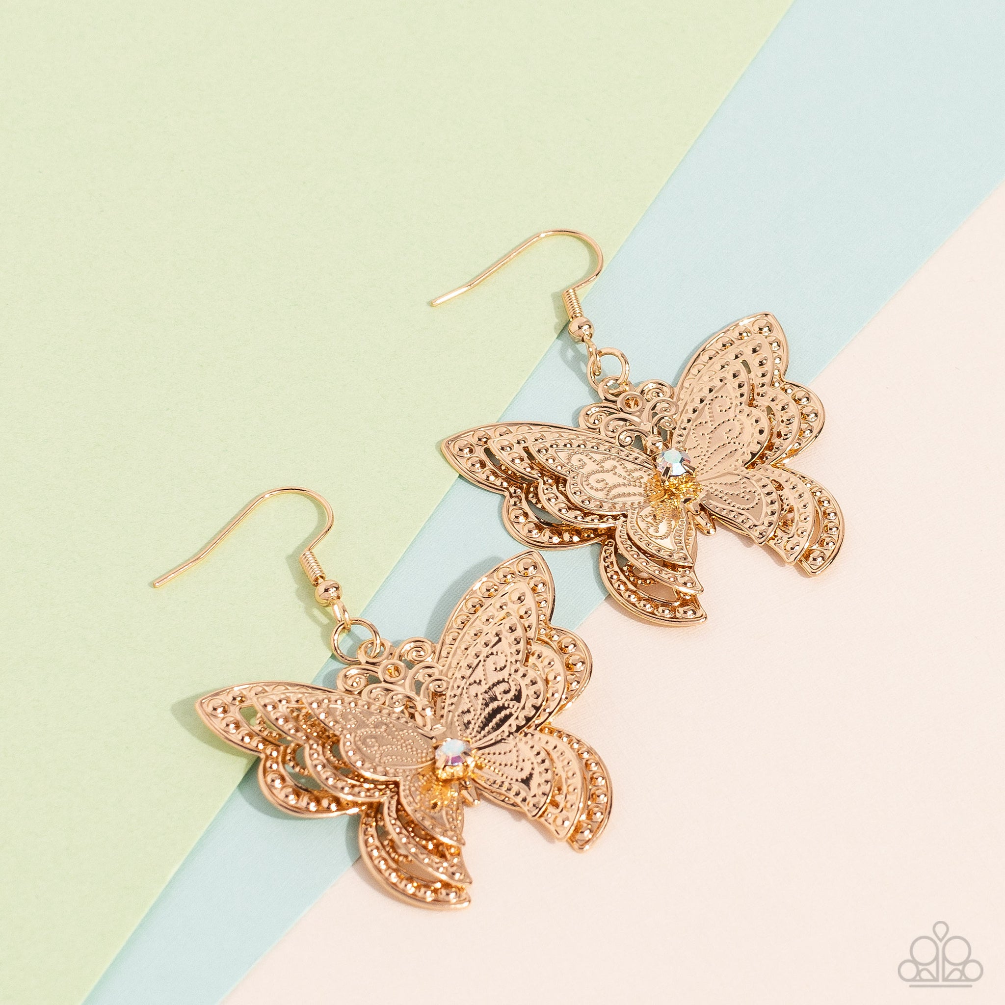 A whimsical 3D butterfly, with ornate details and textures, elegantly increases in size to create a three-layered high-sheen gold lure. An iridescent gem is nestled at the center of the butterfly's wings, creating an additional hint of sparkle. Earring attaches to a standard fishhook fitting. Due to its prismatic palette, color may vary.