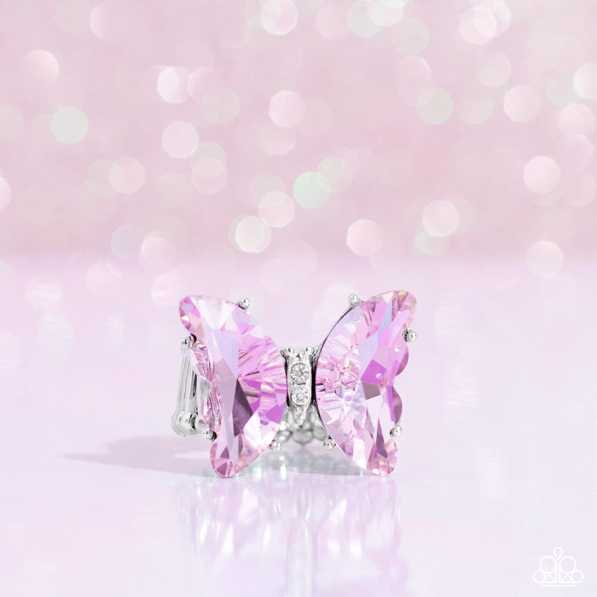 Featuring a faceted crystal finish, a pair of glittery pink gems adorns the scalloped wings of a rhinestone-bodied silver butterfly atop the finger for an eye-catching finish. Features a stretchy band for a flexible fit.