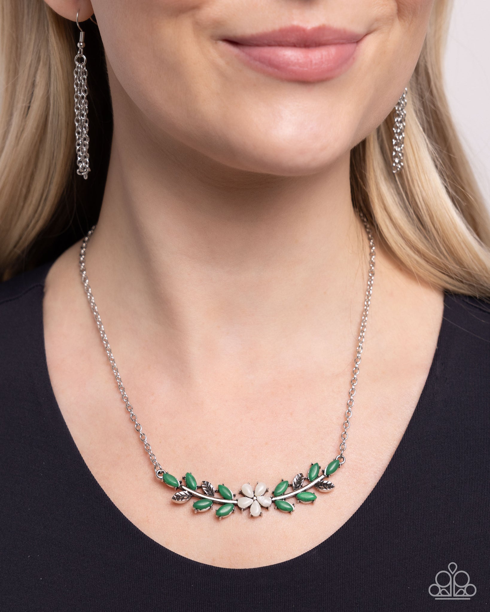 Attached to a silver chain, a silver horizontal bar curves upwards below the neckline. Pronged in place and blooming from the silver vine-like bar, a collection of textured silver and jade leaves leads the eye to a white stone flower pendant in the center for a whimsical display. Features an adjustable clasp closure. As the stone elements in this piece are natural, some color variation is normal.