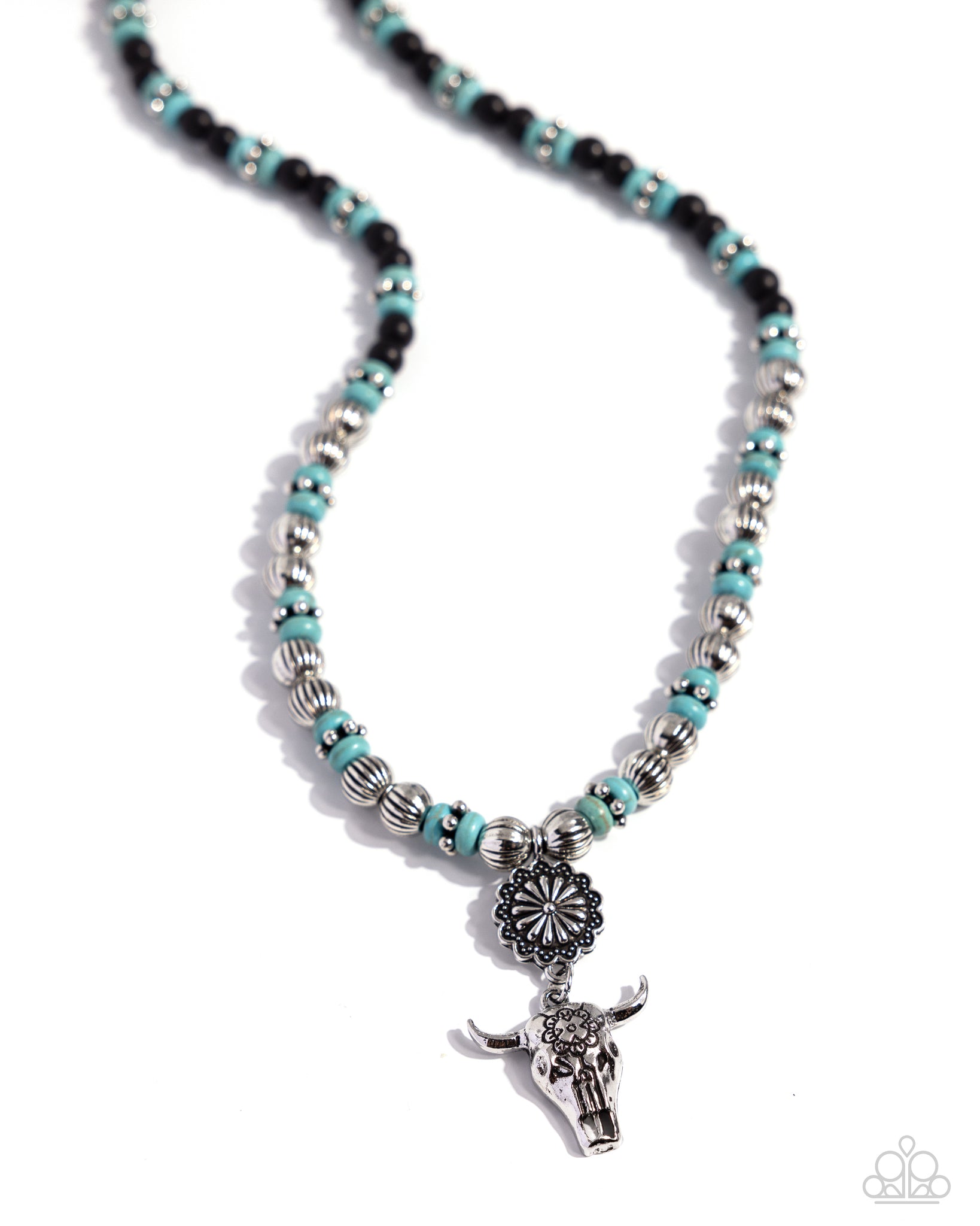 Infused along an invisible string, a collection of textured and floral silver beads alternates with turquoise discs and black stone beads for a Southwestern statement. A tactile-detailed silver floral pendant gives way to an embellished silver longhorn skull at the center of the strand, finishing the design off with some eye-catching earthiness. Features an adjustable clasp closure. As the stone elements in this piece are natural, some color variation is normal.