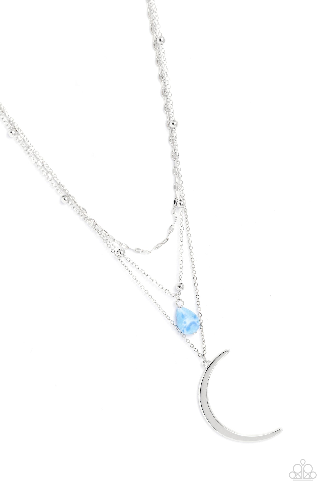 Three dainty silver chains delicately layer below the collar. Antiqued silver links form the uppermost chain, while a blue teardrop bead rests amidst silver studs on the centermost chain. A silver crescent moon pendant swings from the bottom of the display for a mystical finish. Features an adjustable clasp closure. As the stone elements in this piece are natural, some color variation is normal.