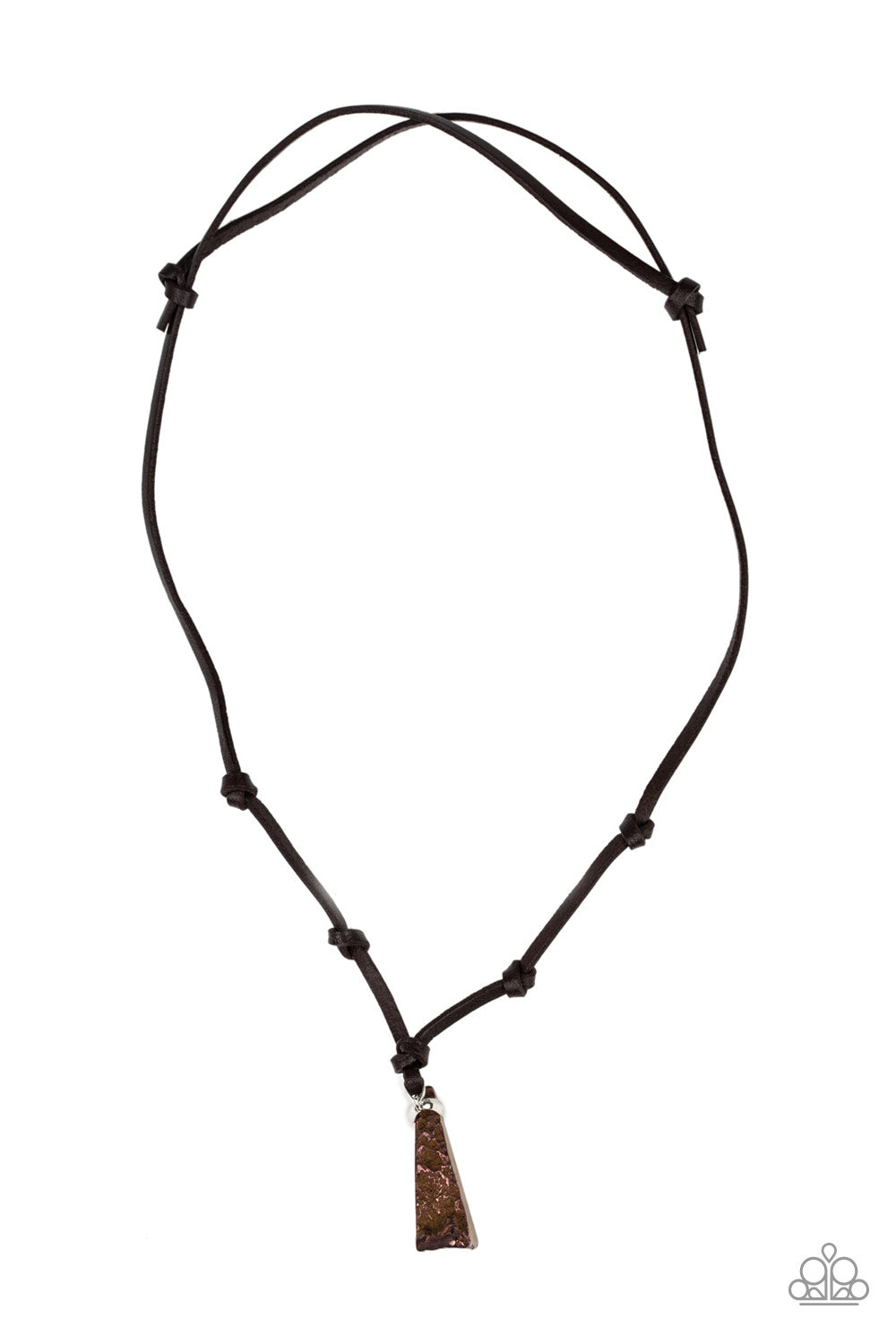 A raw piece of coppery hematite swings from the bottom of a knotted black leather strand, creating an earthy urban pendant. Features an adjustable sliding knot closure.