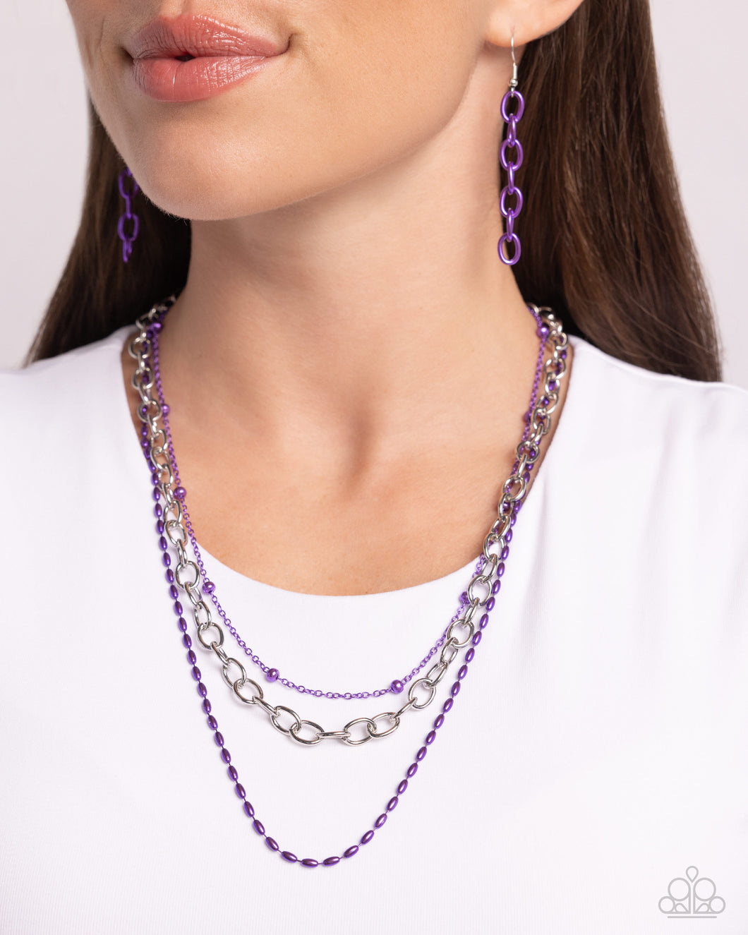A sleek silver link chain swings from the middle of a display of mismatched dainty purple chains, creating an edgy layered display. Features an adjustable clasp closure.