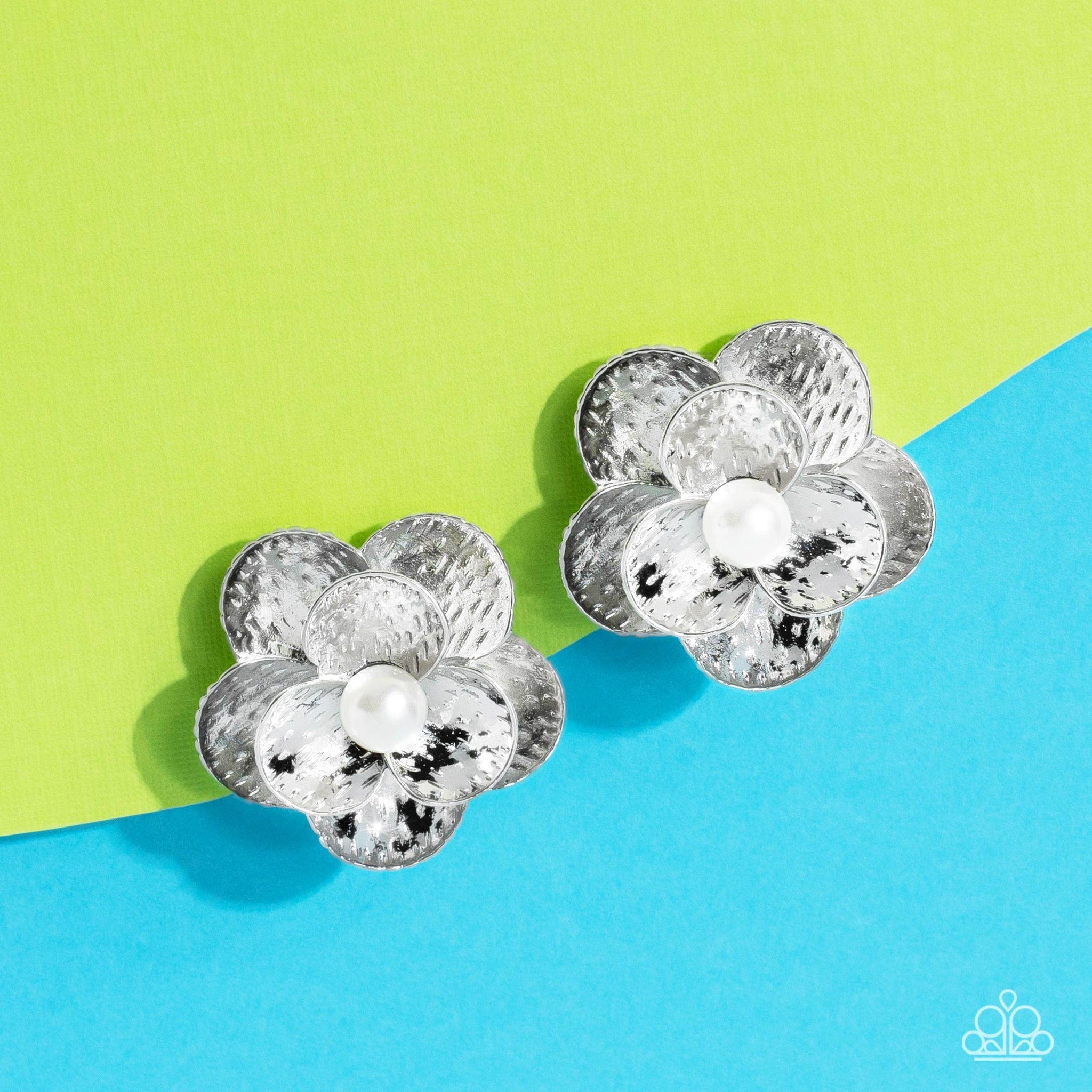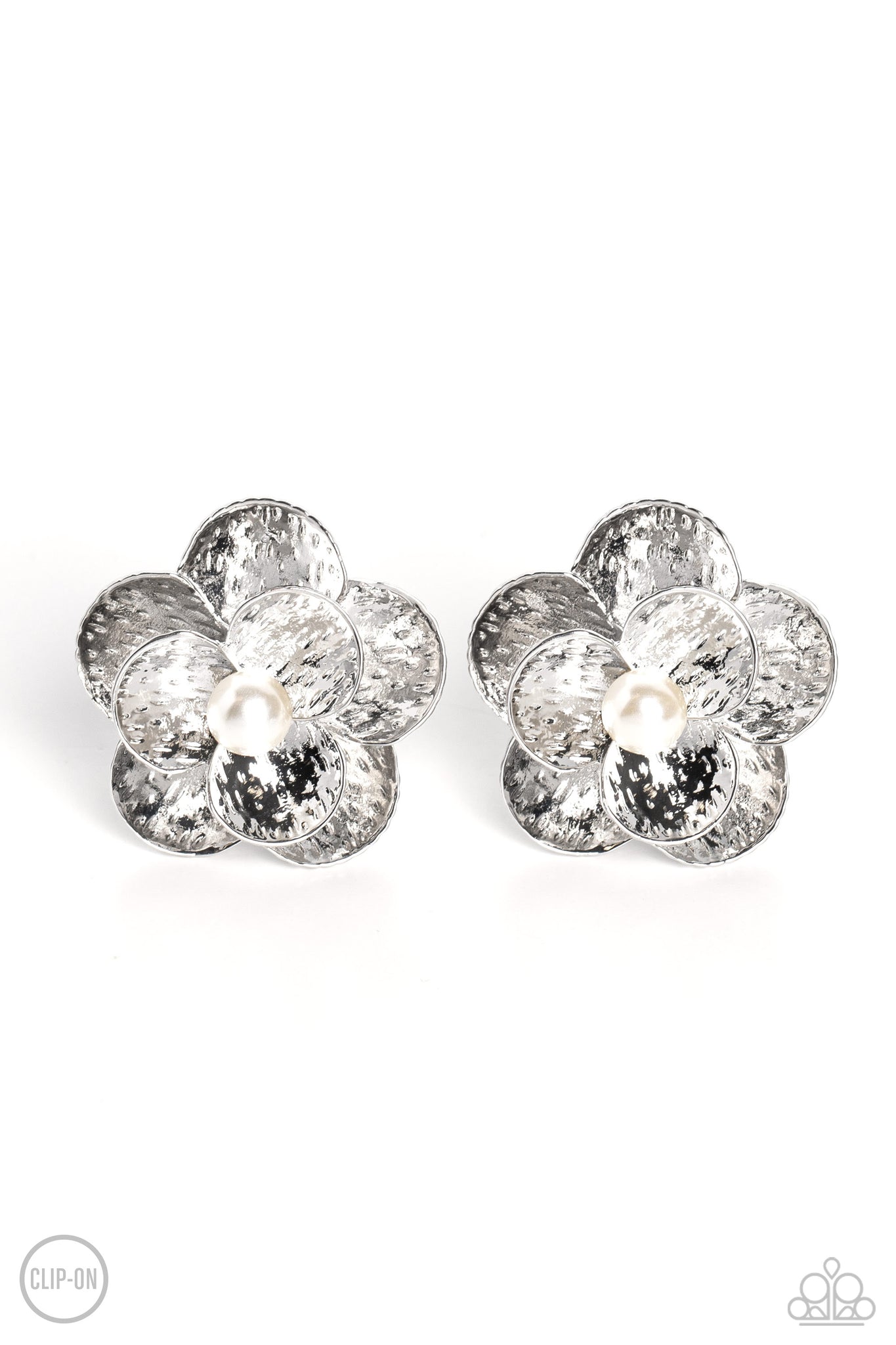 Flaring out from a white pearl center, silver flowers, featuring studded petals, grace the ear. An oversized silver flower, featuring the same studded design as the smaller flower, creates the 3D design and draws additional attention to the whimsical design. Earring attaches to a standard clip-on fitting.