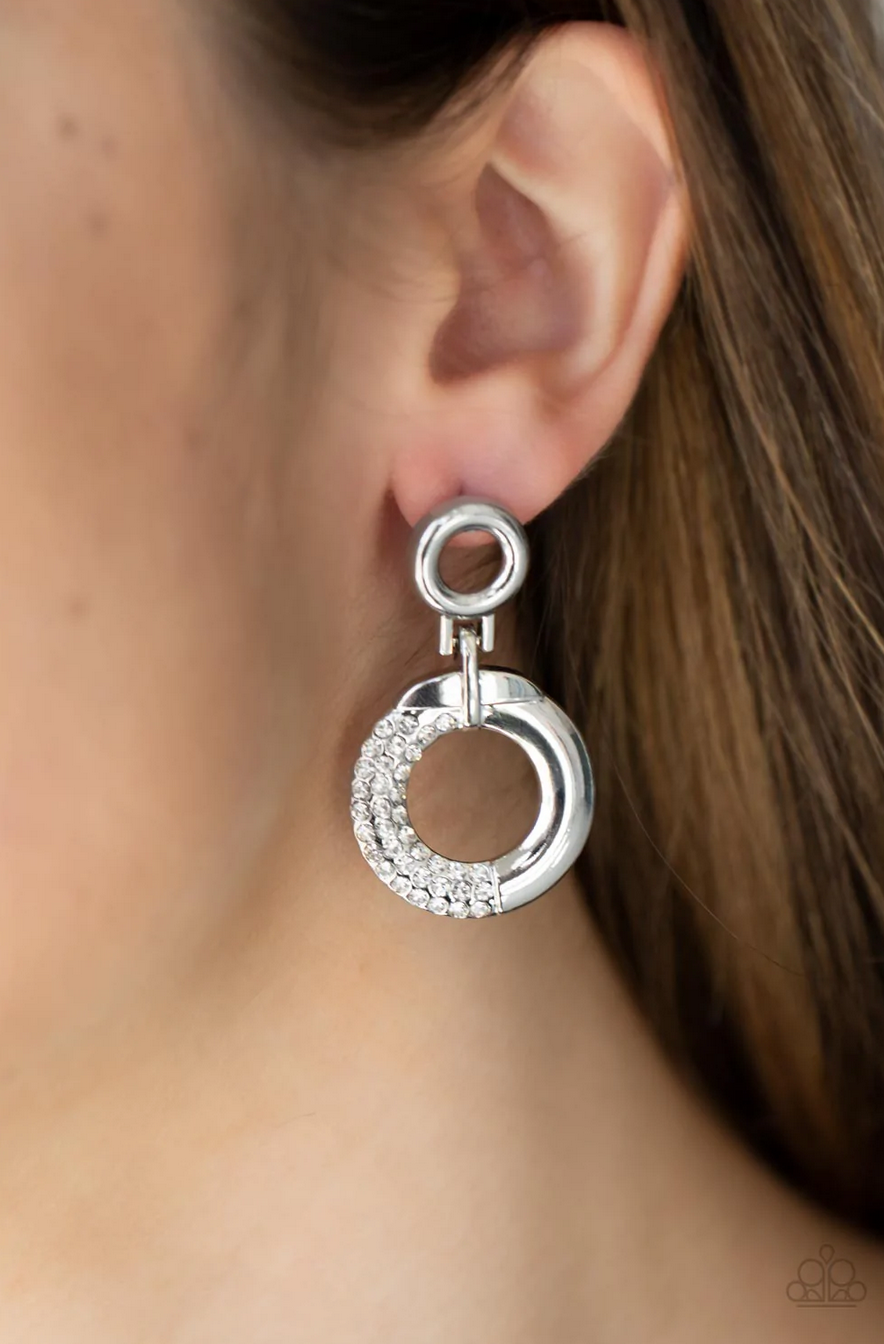 A dainty silver hoop attaches to a shimmery silver ring that is half dipped in glassy white rhinestones, creating a modern look. Earring attaches to a standard post fitting.