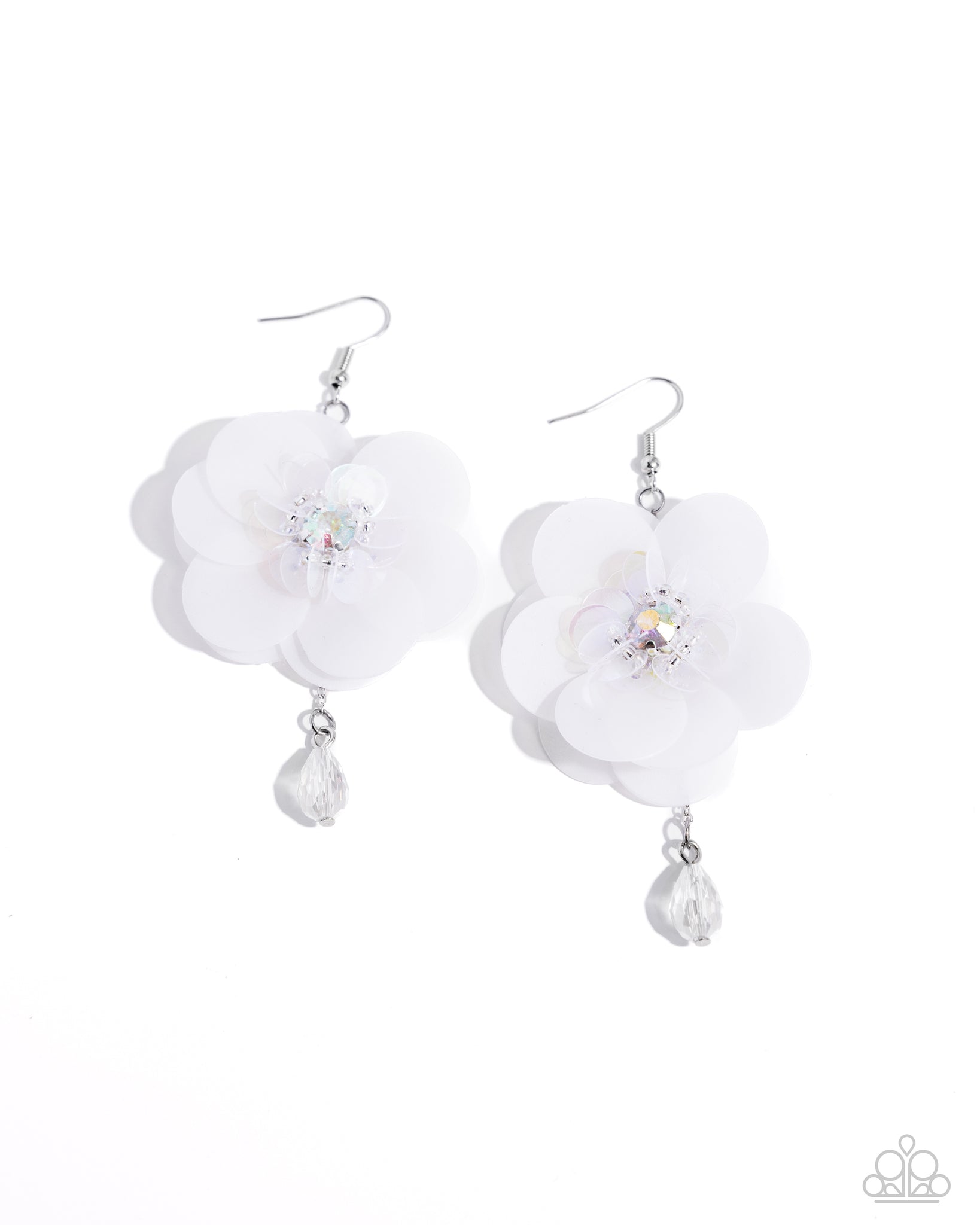 Featuring iridescent sequin petals, larger white sequin petals fan out around an iridescent rhinestone. The elaborate floral centerpiece gives way to a faceted clear white teardrop bead for a refining finish. Earring attaches to a standard fishhook fitting. Due to its prismatic palette, color may vary.