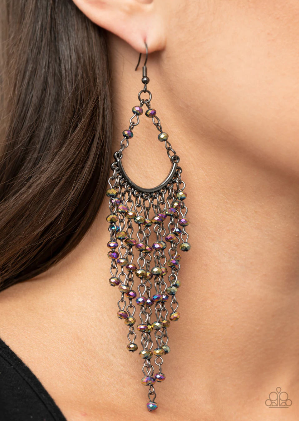 Oil spill rhinestone beaded tassels cascade from the bottom of a bowing gunmetal bar, creating an ethereal tapered fringe. Earring attaches to a standard fishhook fitting.Sold as one pair of earrings.