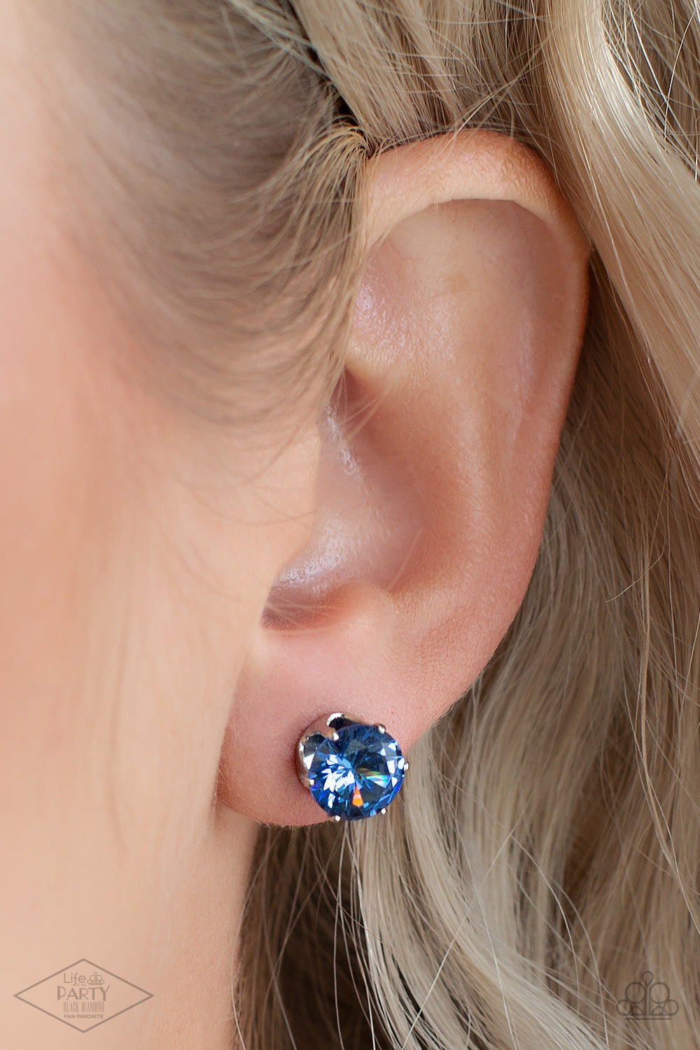 A glassy blue rhinestone is nestled inside of a shimmery silver frame for a timeless look. Earring attaches to a standard post fitting.Sold as one pair of post earrings.