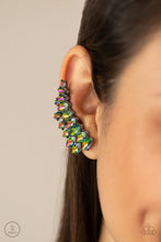 An explosion of marquise-cut oil spill rhinestones delicately climb the ear, coalescing into a smoldering frame. Earring attaches to a standard post fitting. Features a clip-on fitting at the top for a secure fit.Sold as one pair of post earrings.