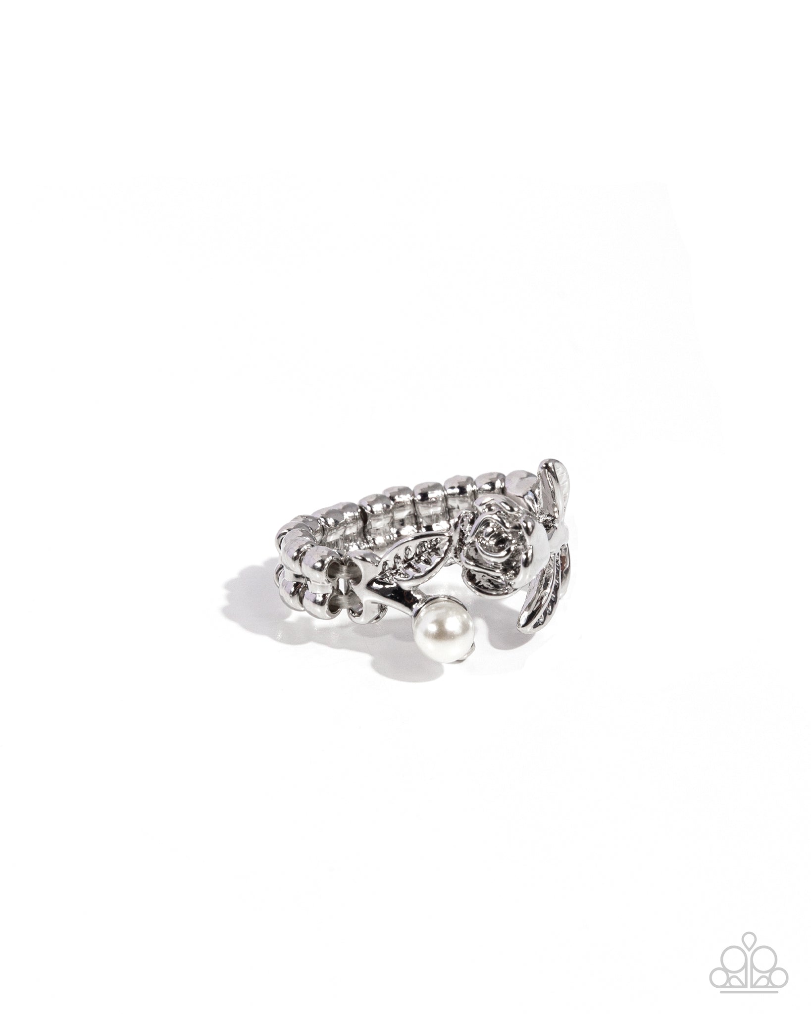 Blooming from the stem of a sleek silver rose, a glossy white pearl curls around the finger for a whimsically refined centerpiece. Features a dainty stretchy band for a flexible fit.