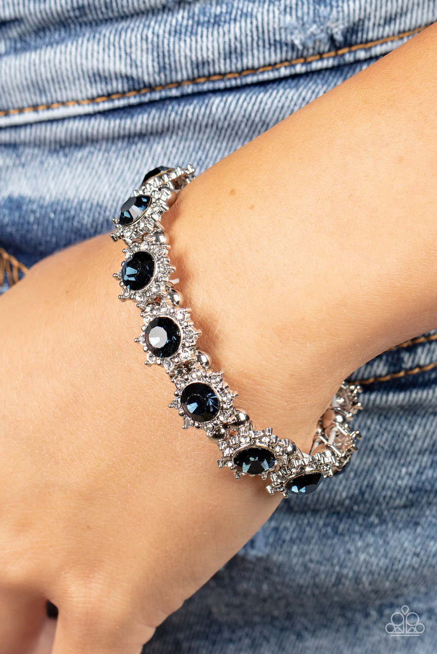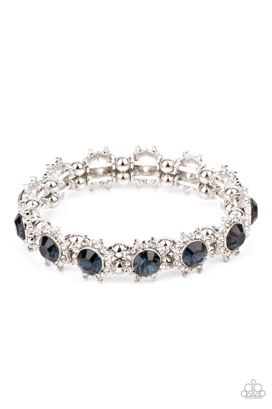 Featuring oversized blue rhinestone centers, glittery white rhinestone floral frames join pairs of classic silver beads along stretchy bands around the wrist for a glamorous display.