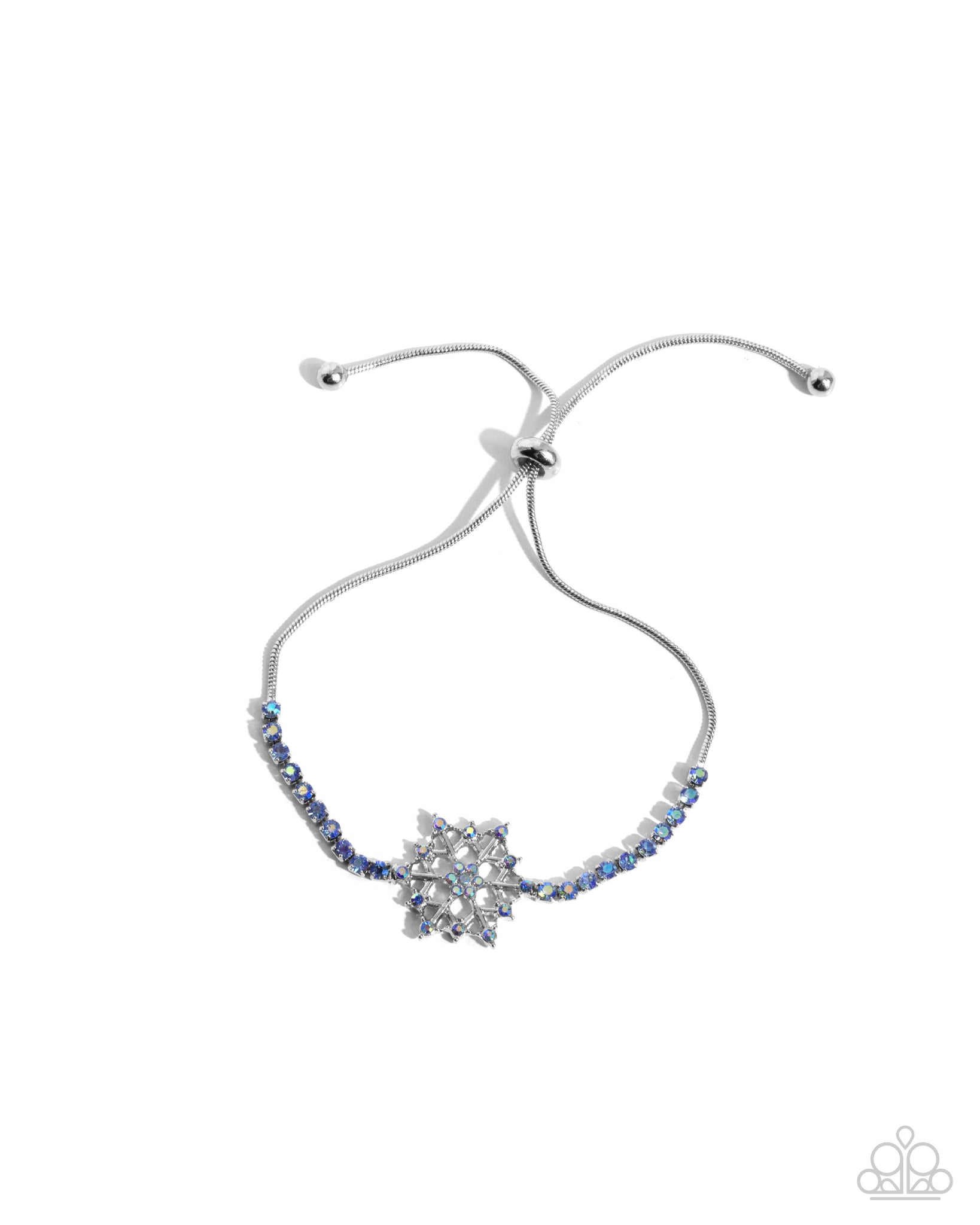 Connecting to a dainty silver snake chain, a collection of light sapphire iridescent rhinestones is pressed in silver square fittings along the wrist for a mismatched display. Dusted in light sapphire iridescent rhinestones, a silver snowflake is featured in the center of the display, for a Christmas-inspired chic finish. Features an adjustable sliding bead closure. Due to its prismatic palette, color may vary.