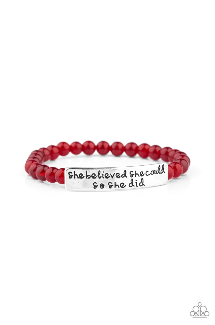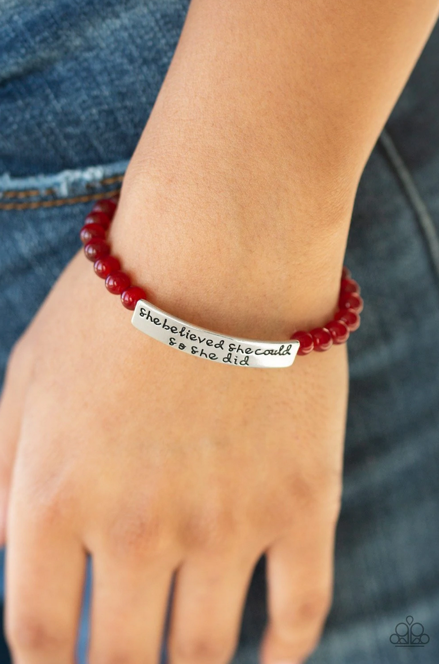 A collection of dainty red cats eye stone beads and an antiqued frame stamped in the inspirational phrase, She believed she could, so she did, are threaded along a stretchy band around the wrist for a whimsical fashion.
