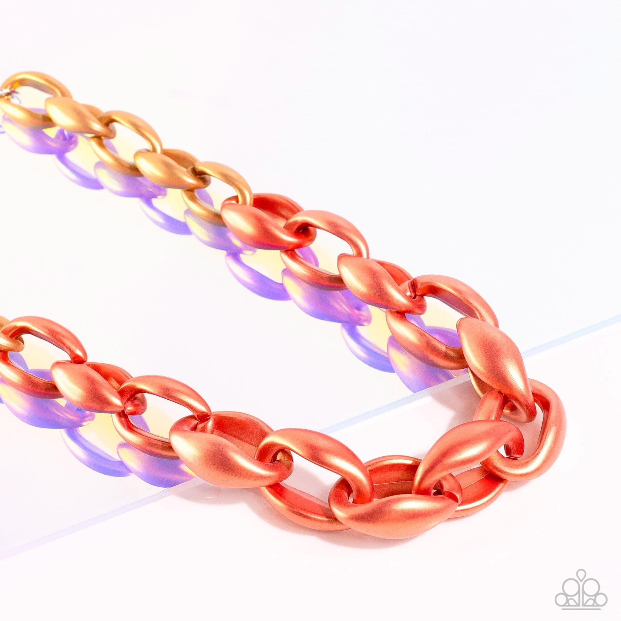Burnt Sienna and Doe concaved hoops gradually increase in size as they elongate towards the middle of the neckline for a colorful combination. Features an adjustable clasp closure.