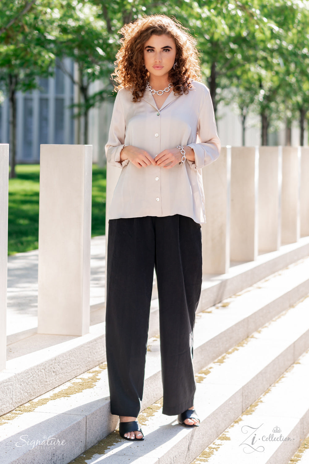 Elegantly enhanced with white rhinestone encrusted links, an effervescent array of white rhinestone encrusted silver hoops glamorously alternate below the collar for an unapologetically audacious sparkle. Features an adjustable clasp closure.